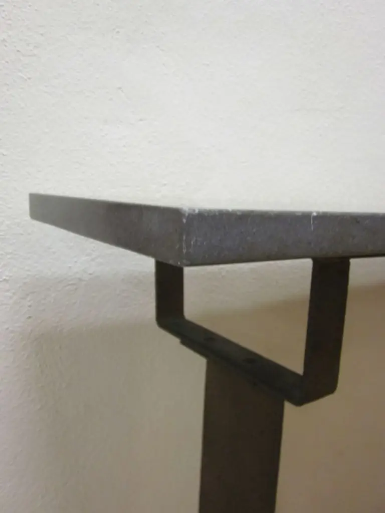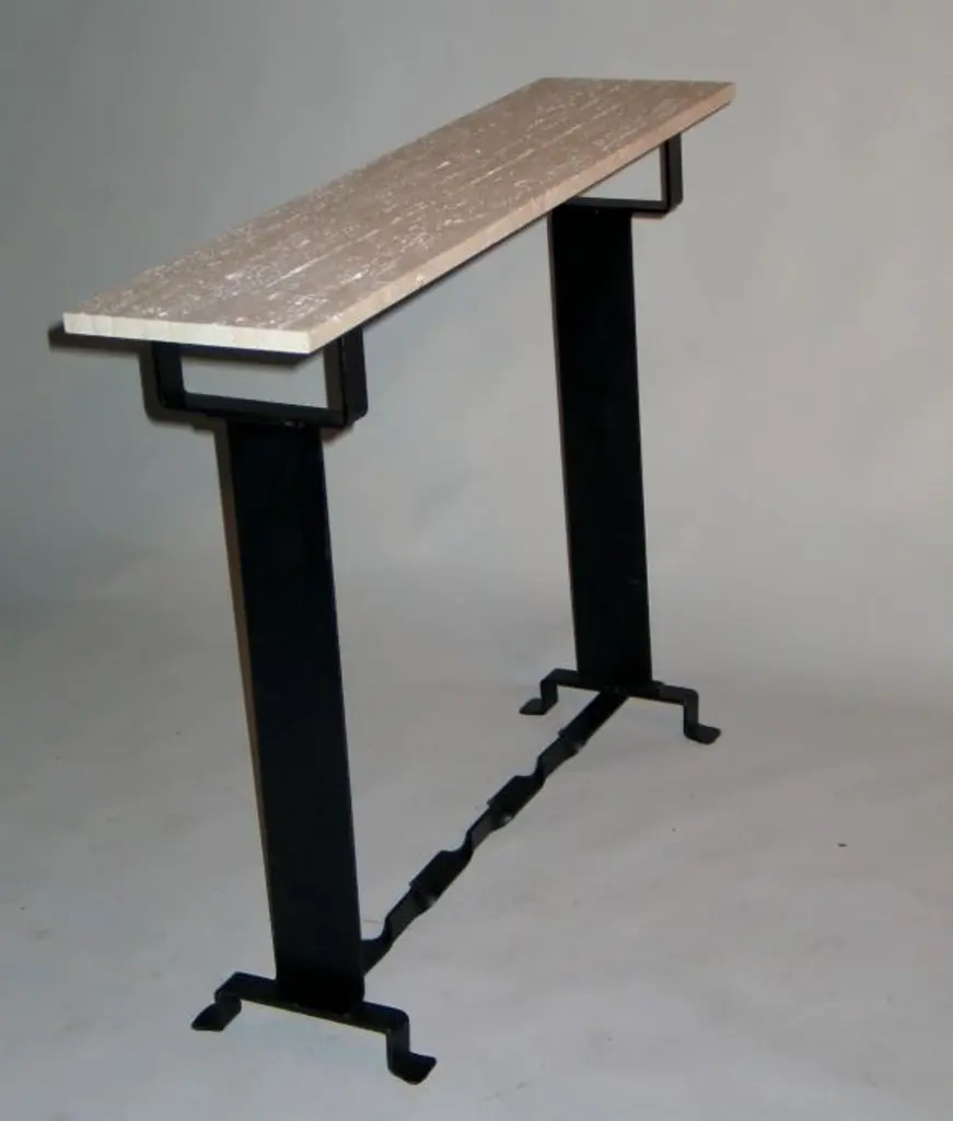 Elegant and sober French Post-Art Deco style consoles in bronzed wrought iron supporting a top of stone. Consoles have a narrow profile with 10.5" depth.Each console is priced and sold separately.