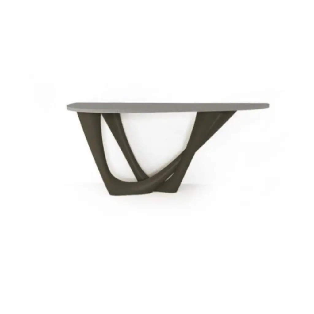 Umbra Grey G-Console Duo concrete top and steel base by ZietaDimensions: D 56 x W 168 x H 75 cm Material: Carbon steel, concrete.Also available in different colors and dimensions.G-Console is another bionic object in our collection. Created for smaller spaces, it gives another possibility in interior planning and at the same time preserves the unique shape of the original G-Table. Both objects were made for enthusiasts of bionic forms. Made with FiDU technology, it reminds of vines or tree roots. Nature symbolizes a constant changeability and harmony that comes out of it. A diverse structure refers to both natural forms and processes. G-Console comes in two versions – Mono and Duo.About Zieta: Zietas main goal is to deliver uniqueness and customization in design and construction while keeping the production, transport, and warehousing innovatively efficient.This is how they imagine the future world: Light, durable structures of customized applications produced on demand out of one-of-a-kind parts, yet efficiently.They use a computer-controlled production process. Customized pattern, customized form, customized function, one-of-a-kind product, and outstanding precision are what they deliver.You will find all of this philosophy reflected in the products. They research, they discover new possibilities, they play with forms and they deliver a beautiful, innovative, surprising outcome to people who love the design and who care about design development.They believe their work is a valuable contribution to the world of design not only by the unique beauty of the forms but most of all by opening ultra-innovative opportunities of forming and new paths for the world of the future.