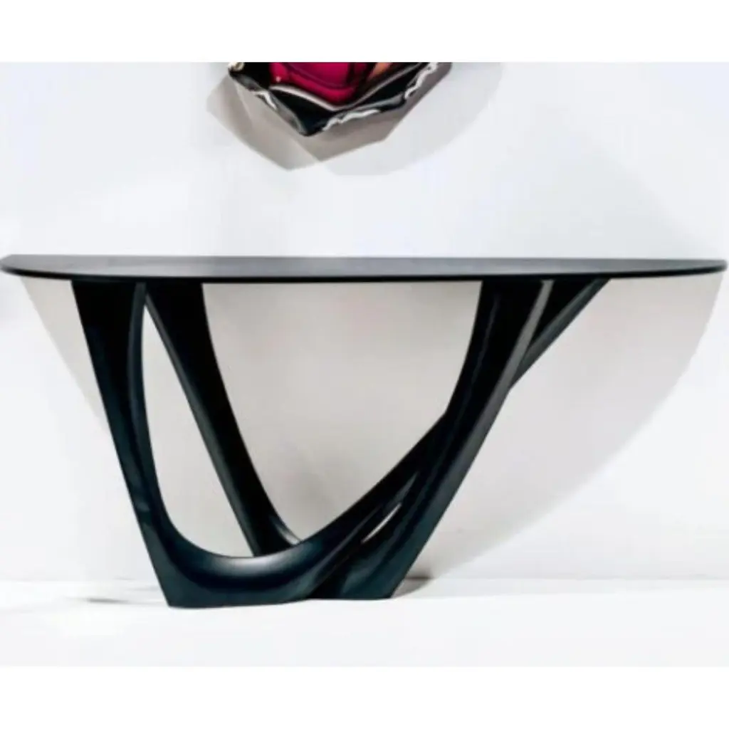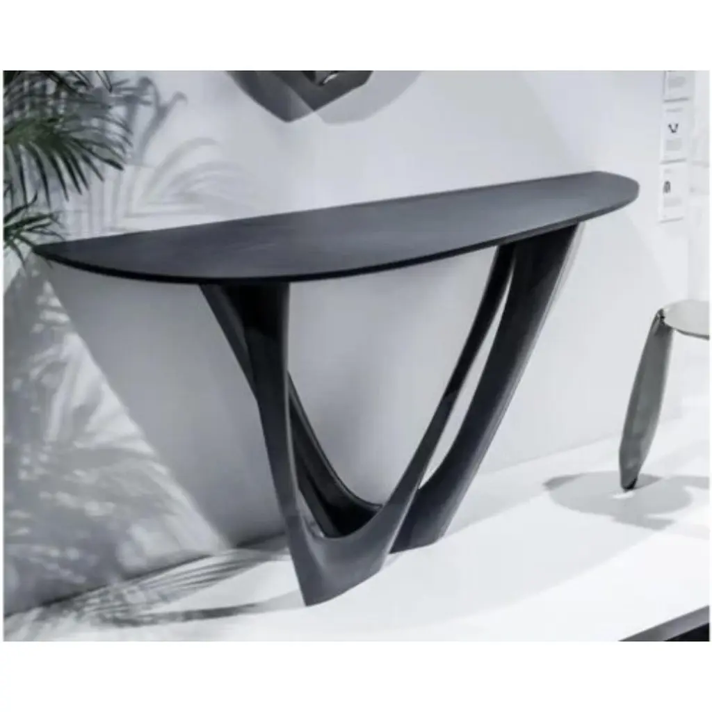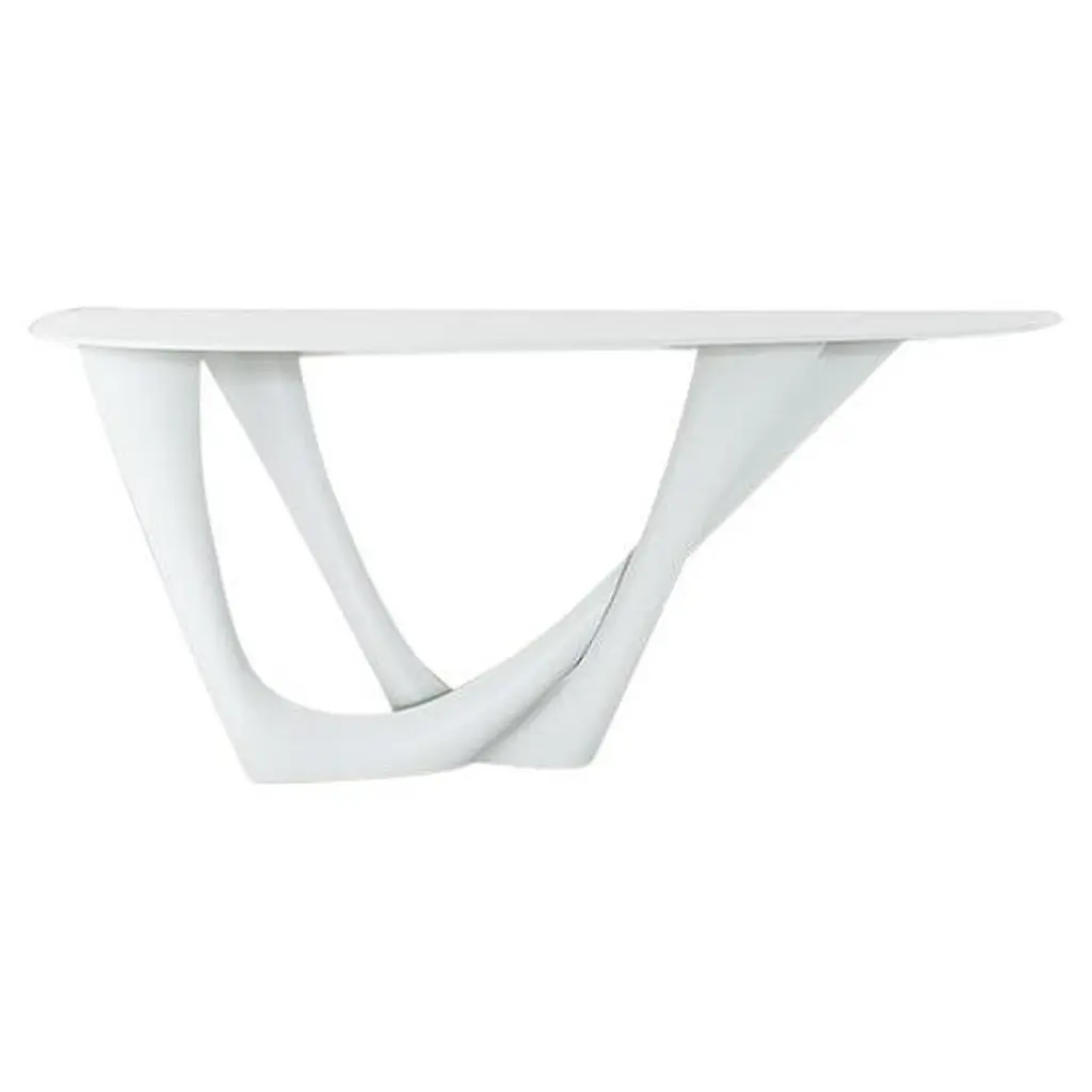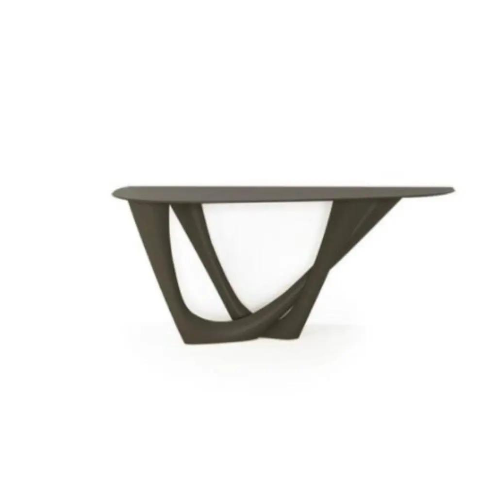Umbra grey G-Console duo steel base and top by ZietaDimensions: D 56 x W 168 x H 75 cm Material: Steel.Also available in different colors and dimensions.G-Console is another bionic object in our collection. Created for smaller spaces, it gives another possibility in interior planning and at the same time preserves the unique shape of the original G-Table. Both objects were made for enthusiasts of bionic forms. Made with FiDU technology, it reminds of vines or tree roots. Nature symbolizes a constant changeability and harmony that comes out of it. A diverse structure refers to both natural forms and processes. G-Console comes in two versions – Mono and Duo.About Zieta: Zietas main goal is to deliver uniqueness and customization in design and construction while keeping the production, transport, and warehousing innovatively efficient.This is how they imagine the future world: Light, durable structures of customized applications produced on demand out of one-of-a-kind parts, yet efficiently.They use a computer-controlled production process. Customized pattern, customized form, customized function, one-of-a-kind product, and outstanding precision are what they deliver.You will find all of this philosophy reflected in the products. They research, they discover new possibilities, they play with forms and they deliver a beautiful, innovative, surprising outcome to people who love the design and who care about design development.They believe their work is a valuable contribution to the world of design not only by the unique beauty of the forms but most of all by opening ultra-innovative opportunities of forming and new paths for the world of the future.