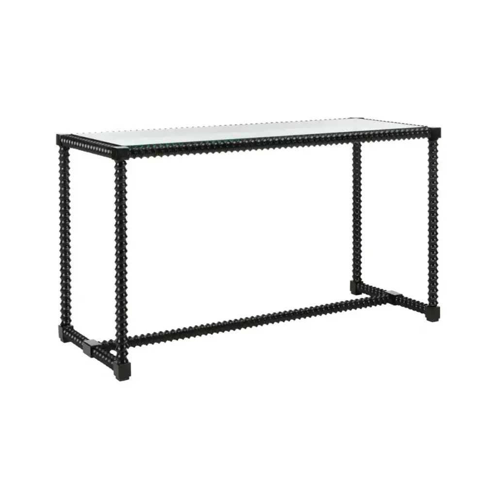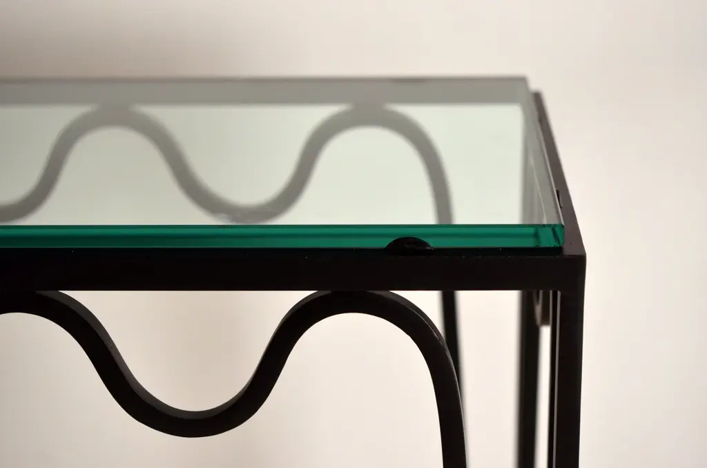 Undulating blackened iron and glass console by DESIGN FRÈRES.These Méandre™ consoles from our exclusive DESIGN FRÈRES® line are handmade in our Los Angeles atelier by our skilled artisans. These classic pieces will blend in, structure and enhance any space.