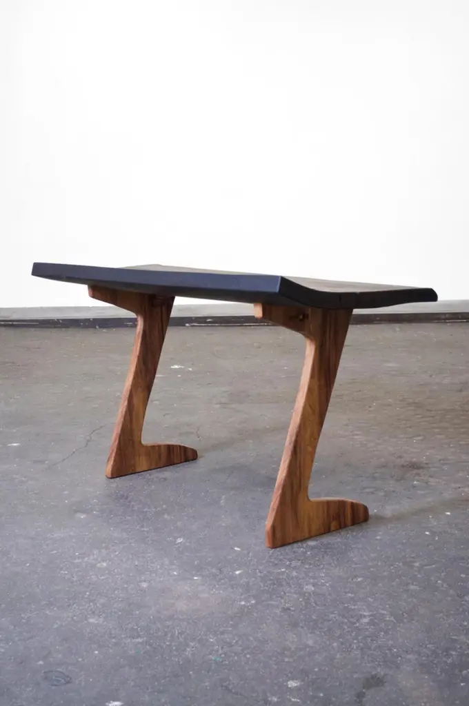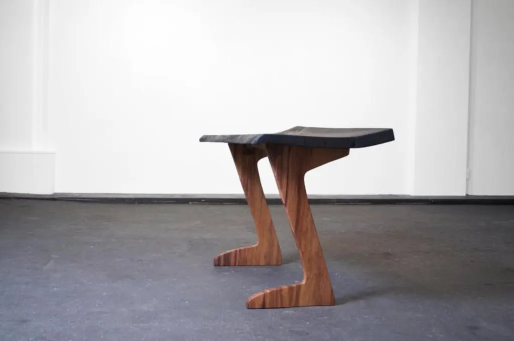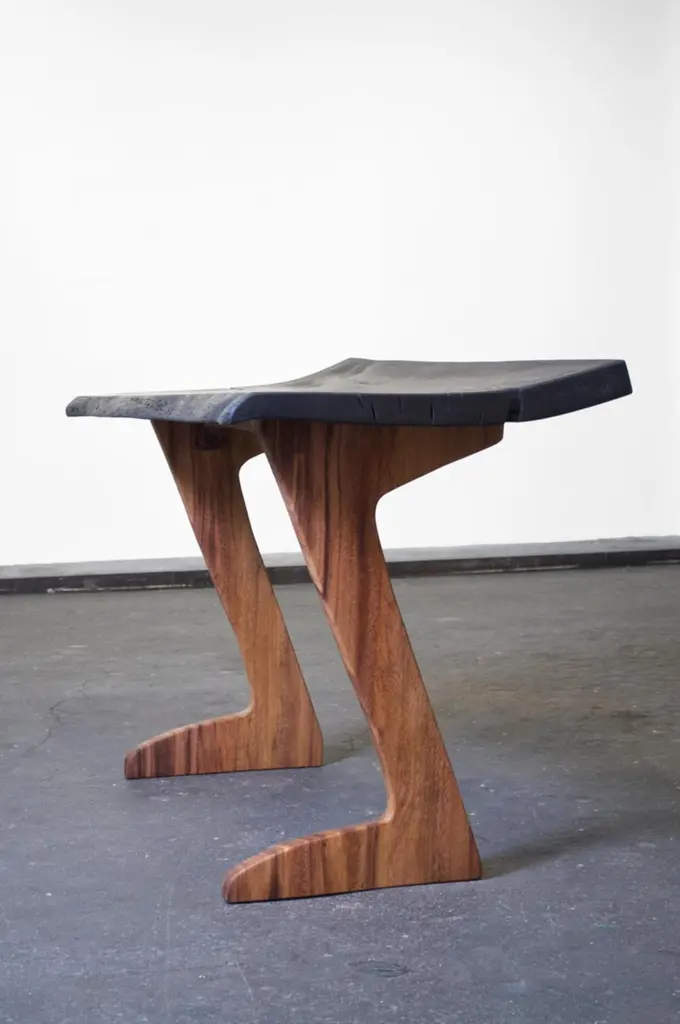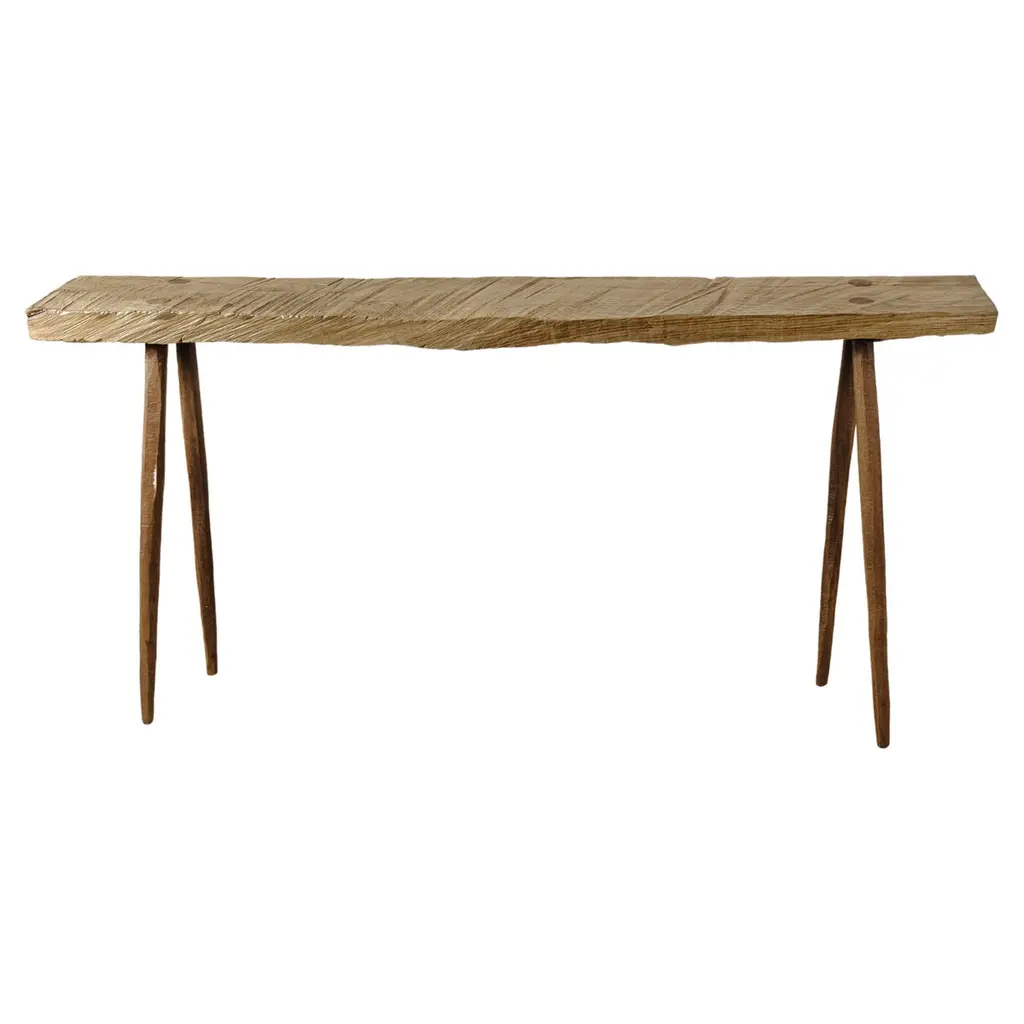 Unique signed console by Jörg PietschmannMaterials: bog oak, curupayMeasures: H 81 x W 136 x D 60 cm Polished oil finishIn Pietschmann’s sculptures, trees that for centuries were part of a landscape and founded in primordial forces tell stories inscribed in the memory of their fibers.The forms Jörg Pietschmann pares from ancient trees are extensive and astonish with their physical presence, a combination of elegance and primeval nature. Pietschmann’s sculptures are monuments to the trees from which they derive.Being endowed with the ruggedness of primeval matter gives them a veritable vitality: figures that appear to have grown into their sculptural form of their own accord. But Pietschmann’s tangibly present bodies have undergone a considerable degree of metamorphosis.In order to generate these unique tree specimens he examines the tree’s morphology and intrinsic inner map until the courses of its grain, of a curve, knots and cracks concur with his projections. The exploratory process is accompanied by constant modification, giving at the start of each new piece no more than an intimation of the figure that will later emerge. In their completion, Pietschmann’s sculptures once more become universal form.Jörg Pietschmann`s workshop is situated on the countryside close to Hamburg. He works with indigenous timber as oak, lime tree, beech, poplar, olive tree and maple felled by the wind or human hand, together with tropical timber found on his travels.