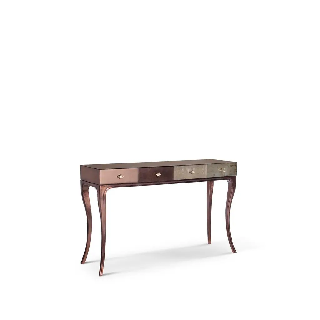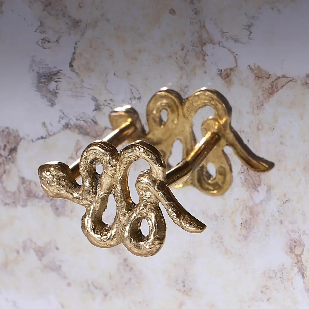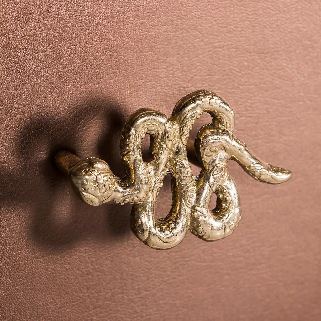 Fierce details packed with primal power, verve, and bite wrap this reptilian console. Drawer fronts are composed of various materials, finely refined by brass-coiled snake hardware.
