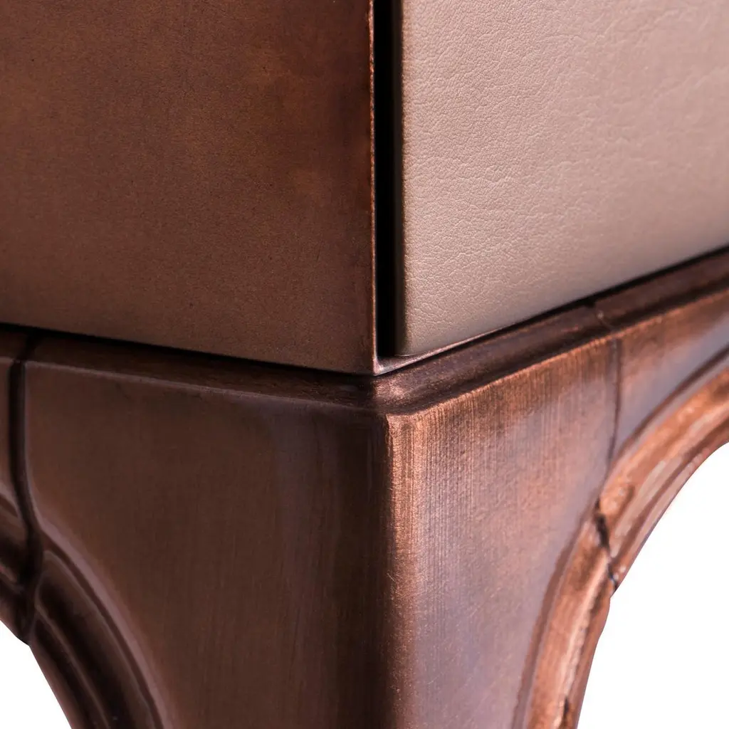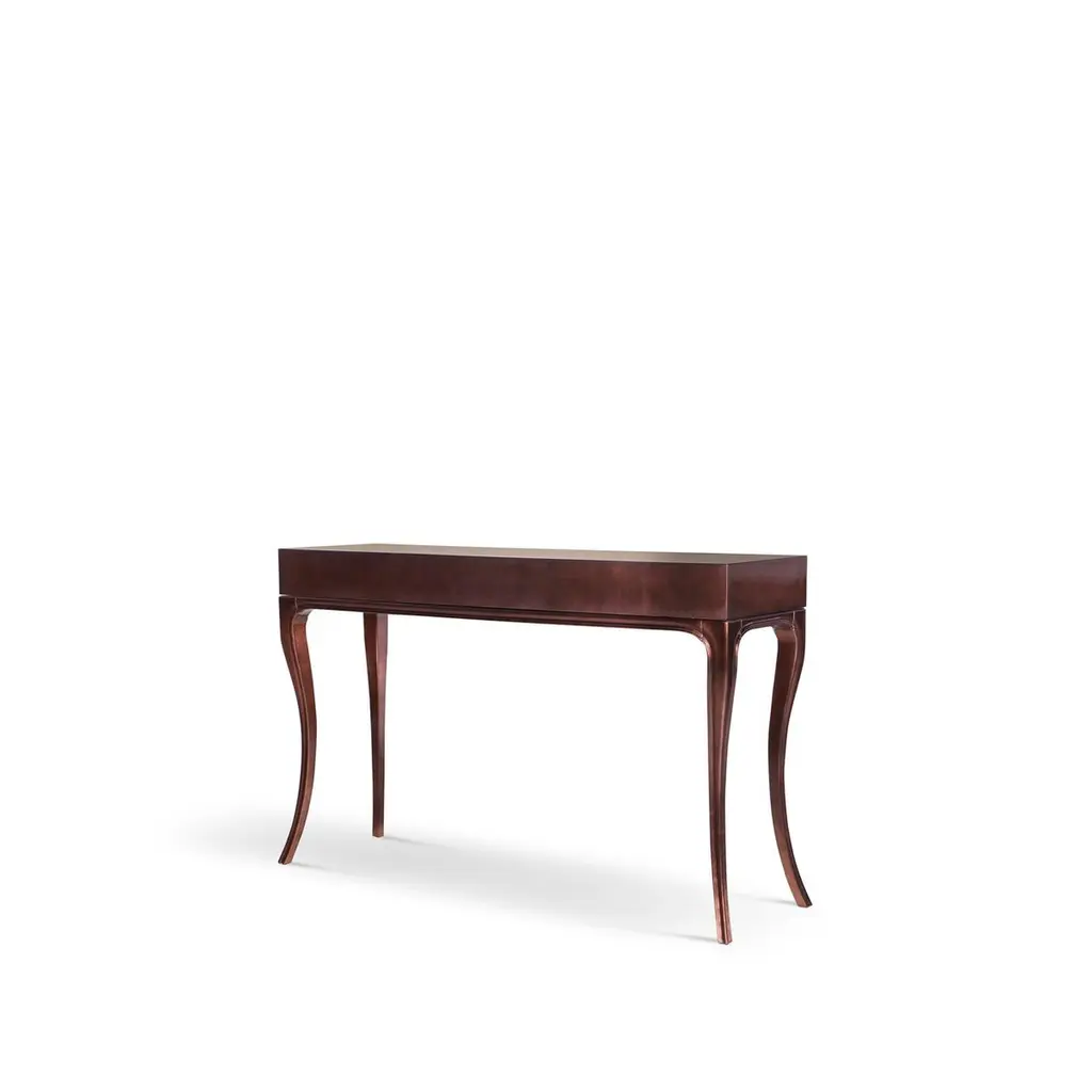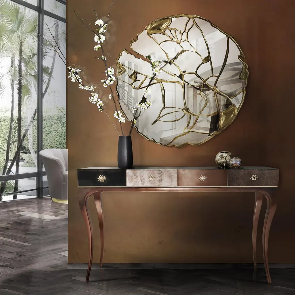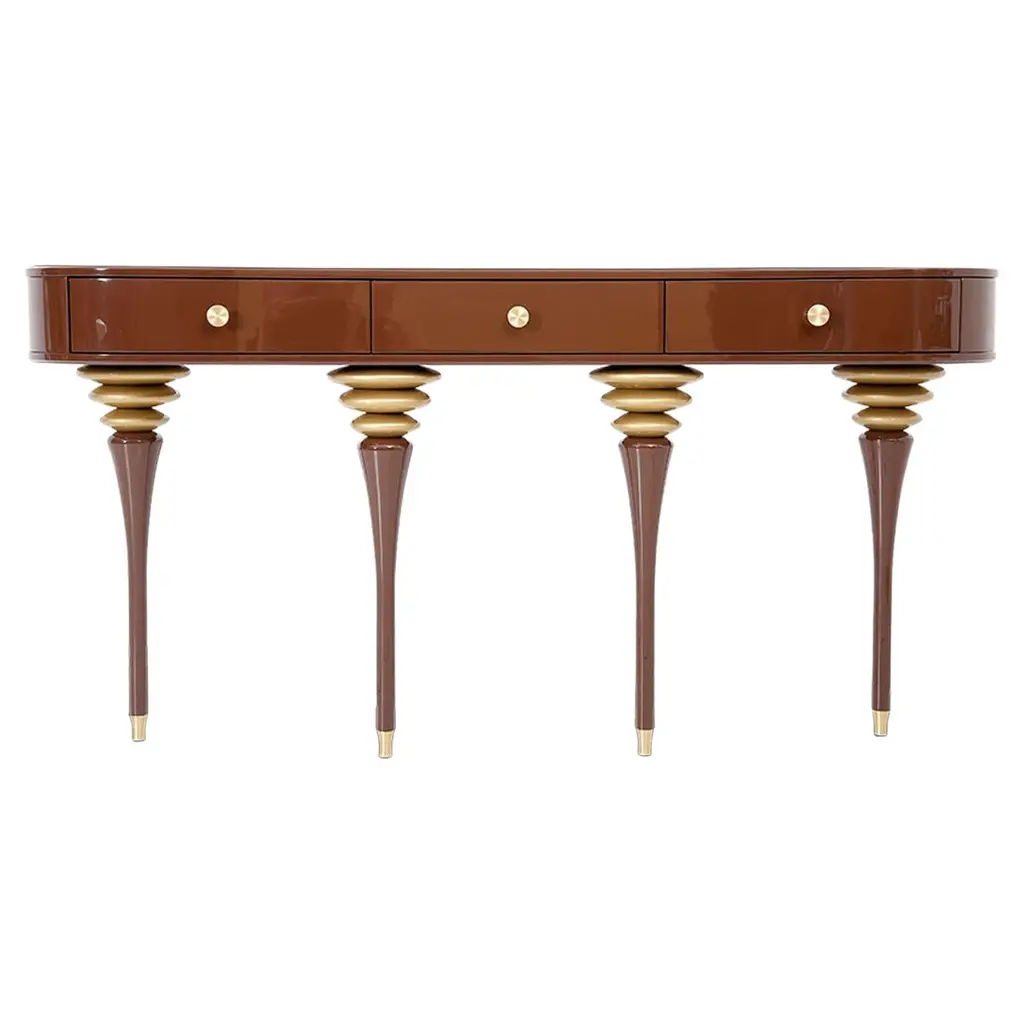 Fierce details packed with primal power, verve, and bite wrap this reptilian console. Drawer fronts are composed of various materials, finely refined by brass-coiled snake hardware.
