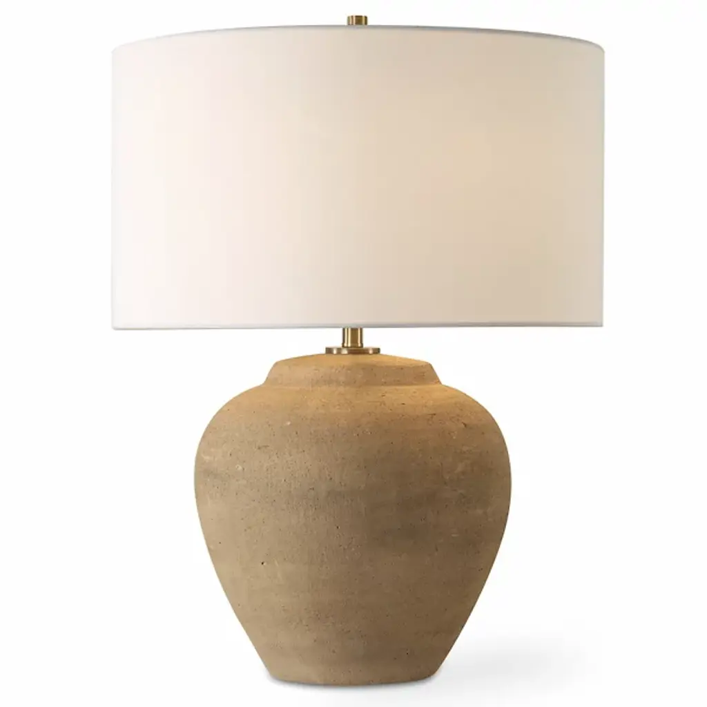 Uttermost Cline Terracotta Table Lamp – Sculpted Ceramic Base with Brass Accents and White Linen Shade, 28” High The Uttermost Cline Table Lamp combines natural texture with sculptural beauty. Its organically shaped terracotta base in a warm, earthy tone is elevated by brass-plated accents, bringing rustic charm and contemporary elegance into balance. Topped with a round hardback shade in crisp white linen, this lamp casts a soft, ambient glow that complements any setting. At 28 inches high with a 12-inch tall shade and 20-inch diameter, this statement piece fits beautifully on console tables, bedside chests, or living room side tables. Key Benefits: Artful Design: Organic ceramic form adds sculptural interest Versatile Aesthetic: Blends well with rustic, modern, or transitional styles Soft Illumination: Linen shade diffuses light for a warm glow Built to Last: Durable materials and stable construction Low Maintenance: Easy to clean and quick to set up