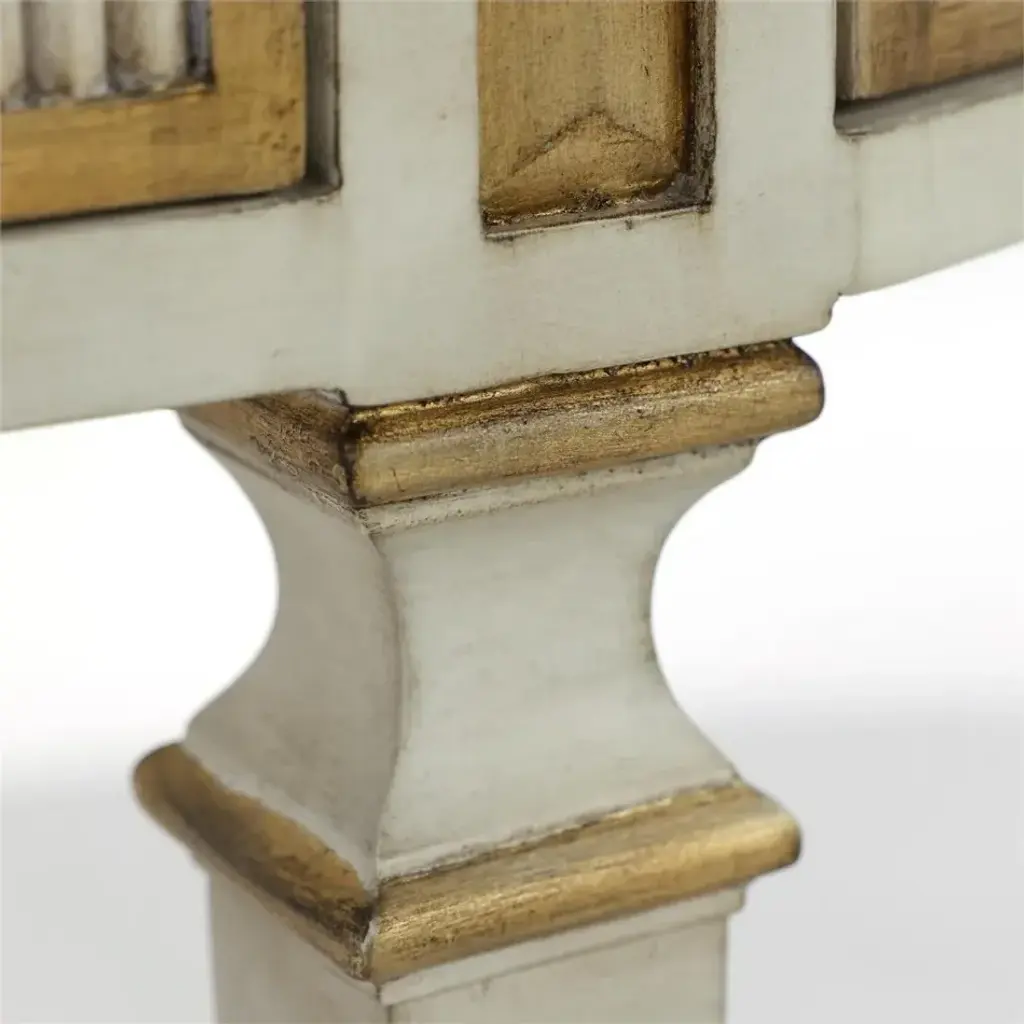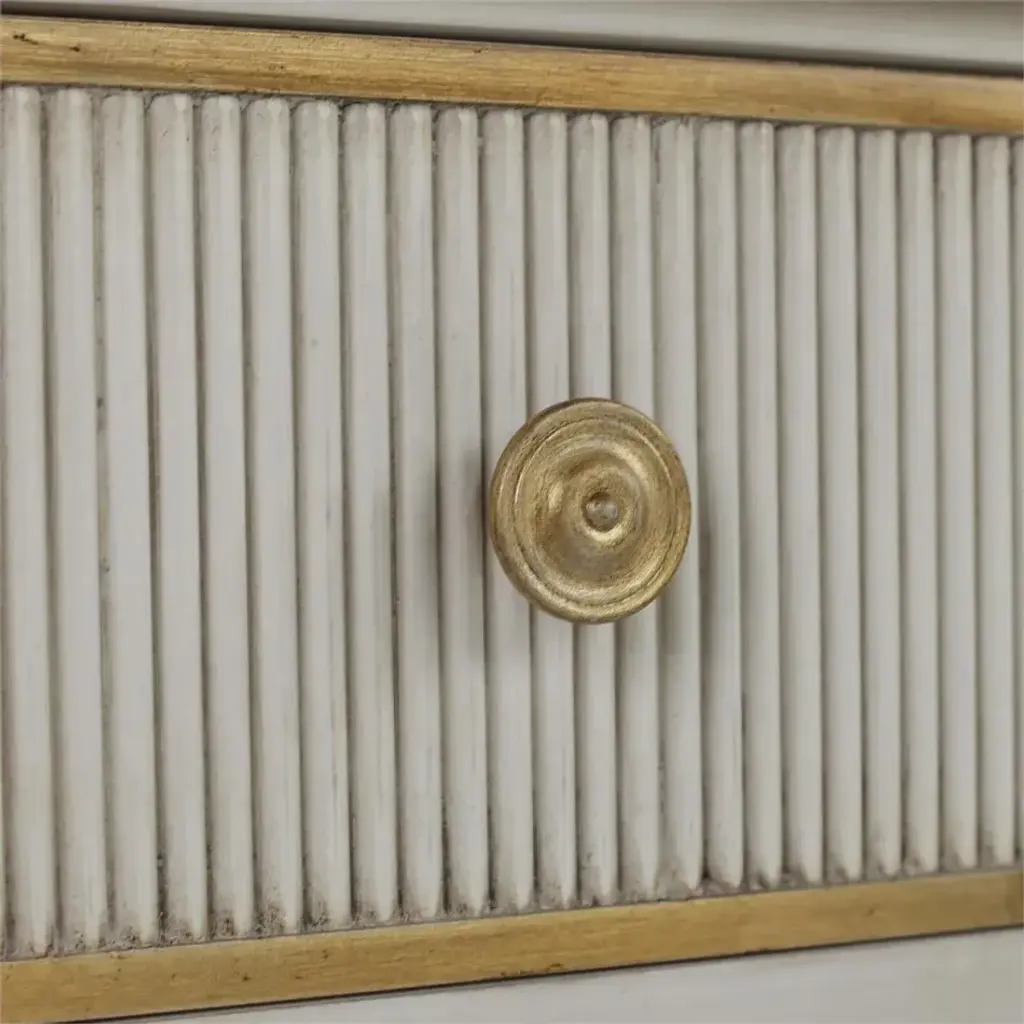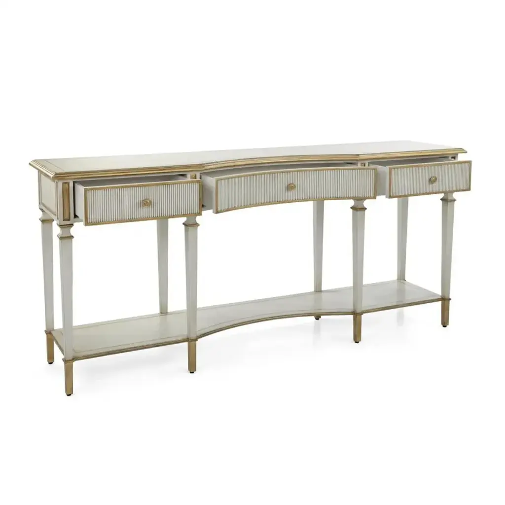 The Vallejo Console Table is a dignified piece that enhances any décor through opulent accents and intricate detailing. This beech wood piece showcases an Antique Beluga finish with detailing in Distressed Gold, along with matching brass handles adorning the three soft closing drawers. Ribbed molding and hand-carved, fluted legs complete the look of this stunning console table.