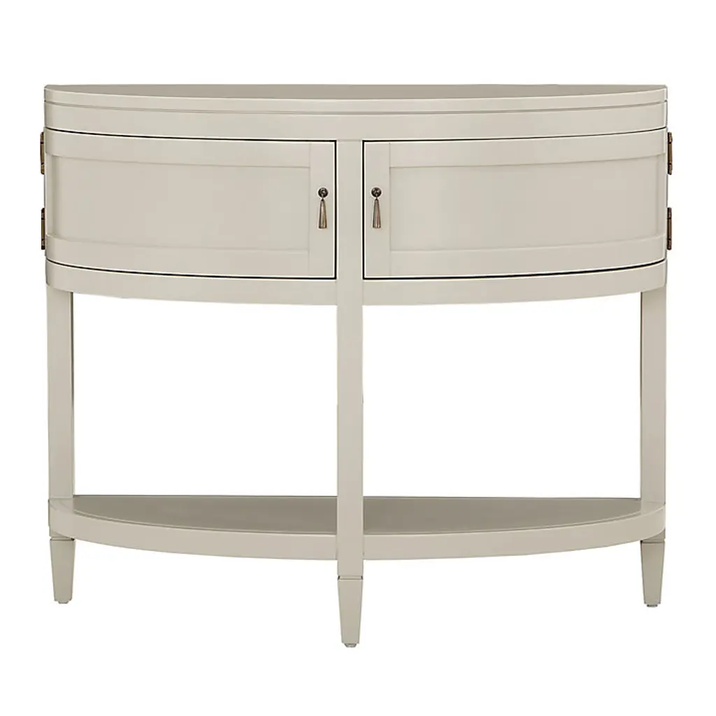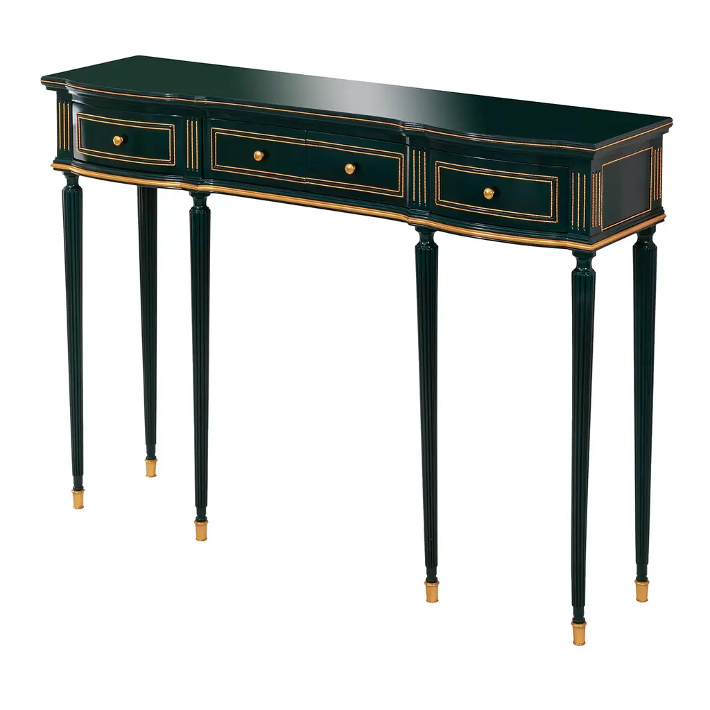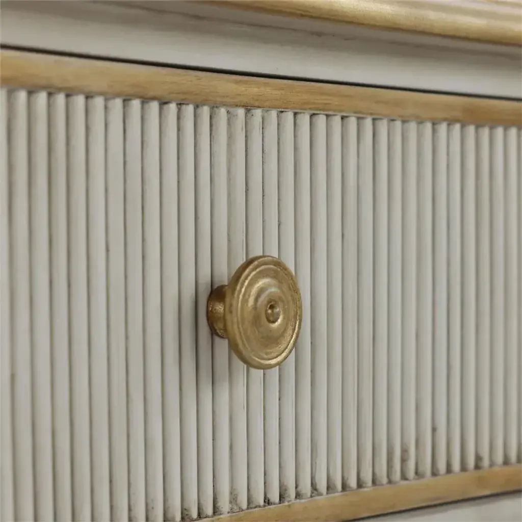 The Vallejo Console Table is a dignified piece that enhances any décor through opulent accents and intricate detailing. This beech wood piece showcases an Antique Beluga finish with detailing in Distressed Gold, along with matching brass handles adorning the three soft closing drawers. Ribbed molding and hand-carved, fluted legs complete the look of this stunning console table.