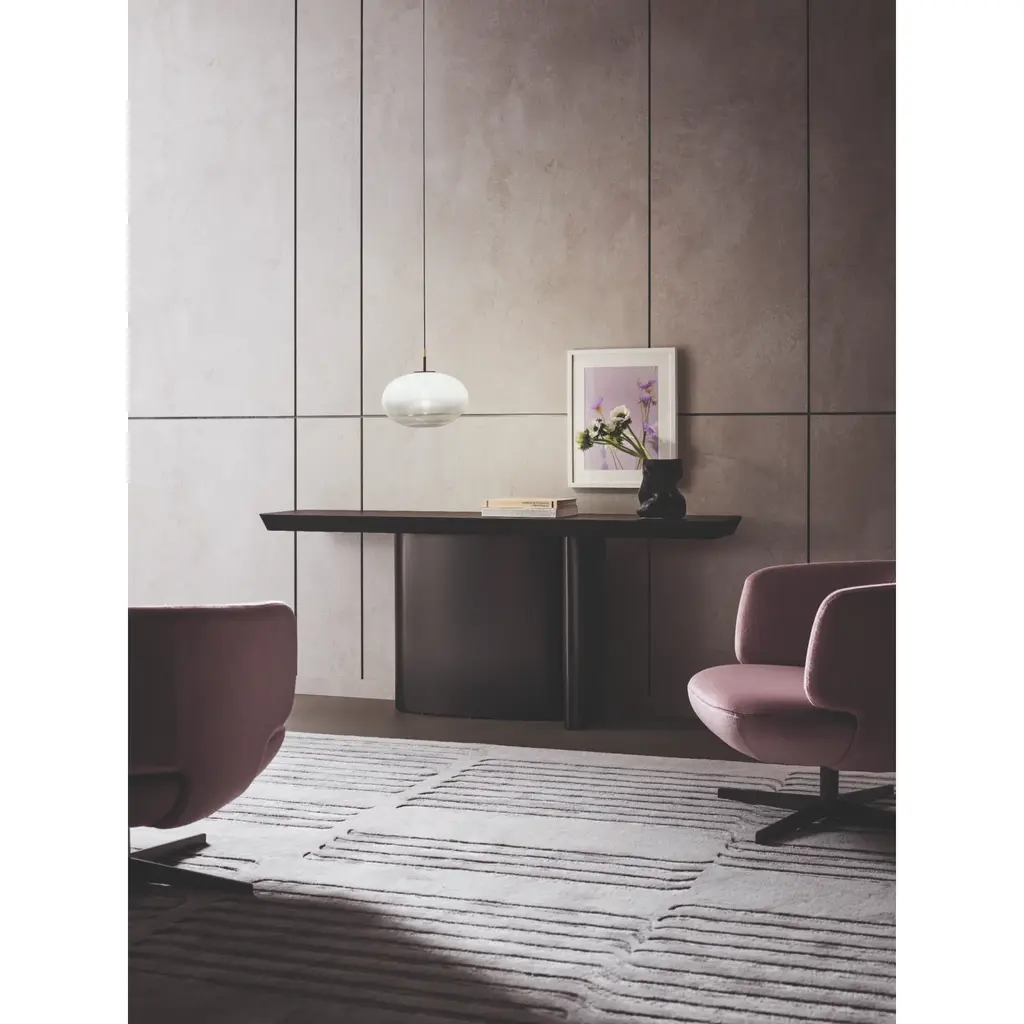 The One Console presents an unexpected, unique and in some ways imperfect piece of architecture that recalls the Dolmens of prehistoric times, which were created by stacking irregular stones in a way that was apparently random and precarious. It is as if the elements that make up the console were not intended to be together, but had instead shifted unexpectedly away from their original position, thereby giving life to a contemporary and recognizable accessory with a striking top and unusual bases. A barely visible opening between the curved modules that form the base allows an interplay of light that illuminates the different profiles of the console's supporting columns. The legs are very close to each other, so much so that from different perspectives the distance is imperceptible; this generates visual instability and a surprising dynamic effect. At the same time, the interplay between the legs gives direction to the console, and therefore to the space in which it is placed. These unusual features give the product a personal richness, making it unique and particularly unexpected.
