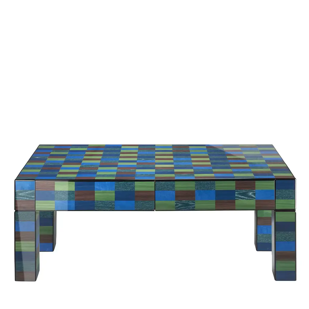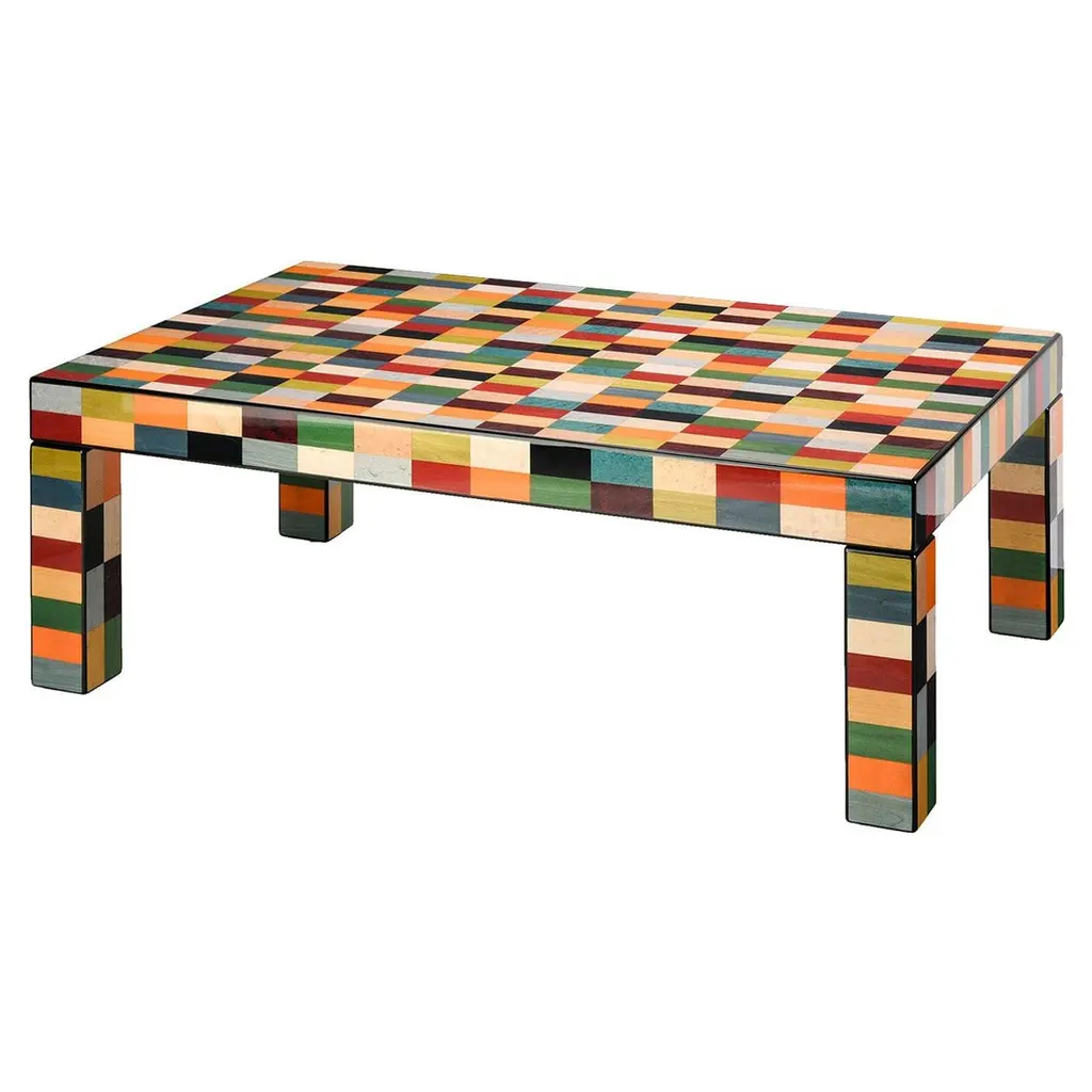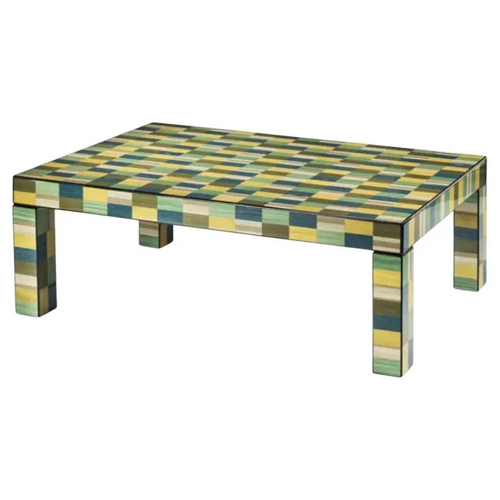 A tribute to modern and abstract art, this splendid console will be a bold and captivating statement in a contemporary or eclectic entryway. Entirely handcrafted of wood, it is veneered with splendid handmade inlay works, polished and brushed for an eye-catching impact. Marked by a series of square figures, it combines yellow, green, and blue shades.
