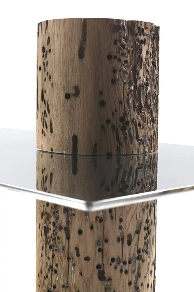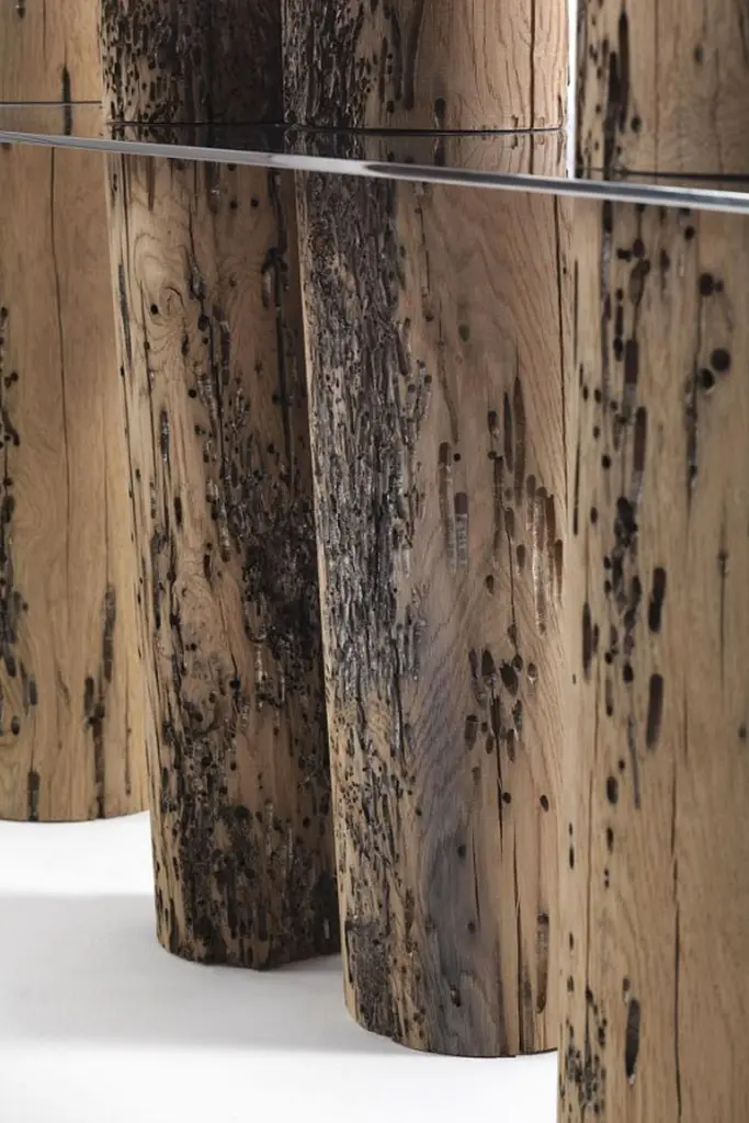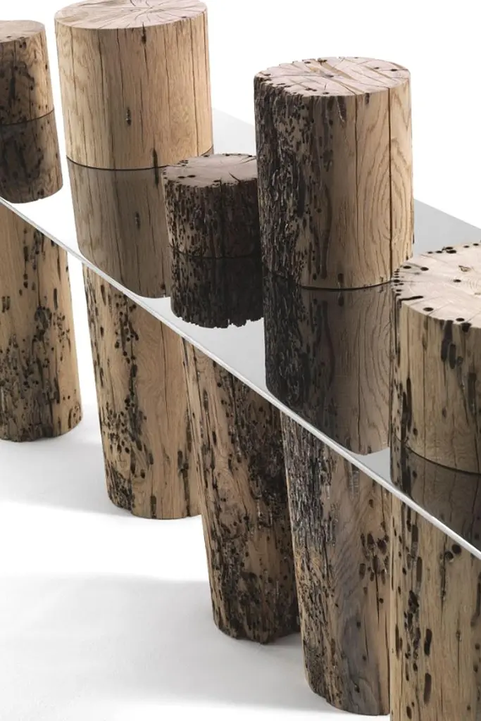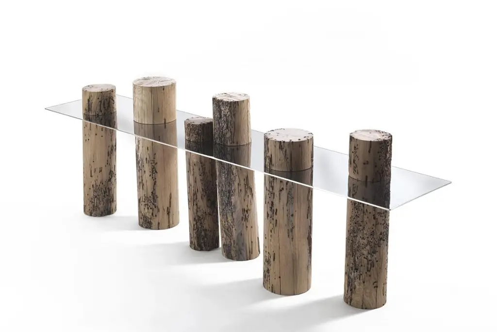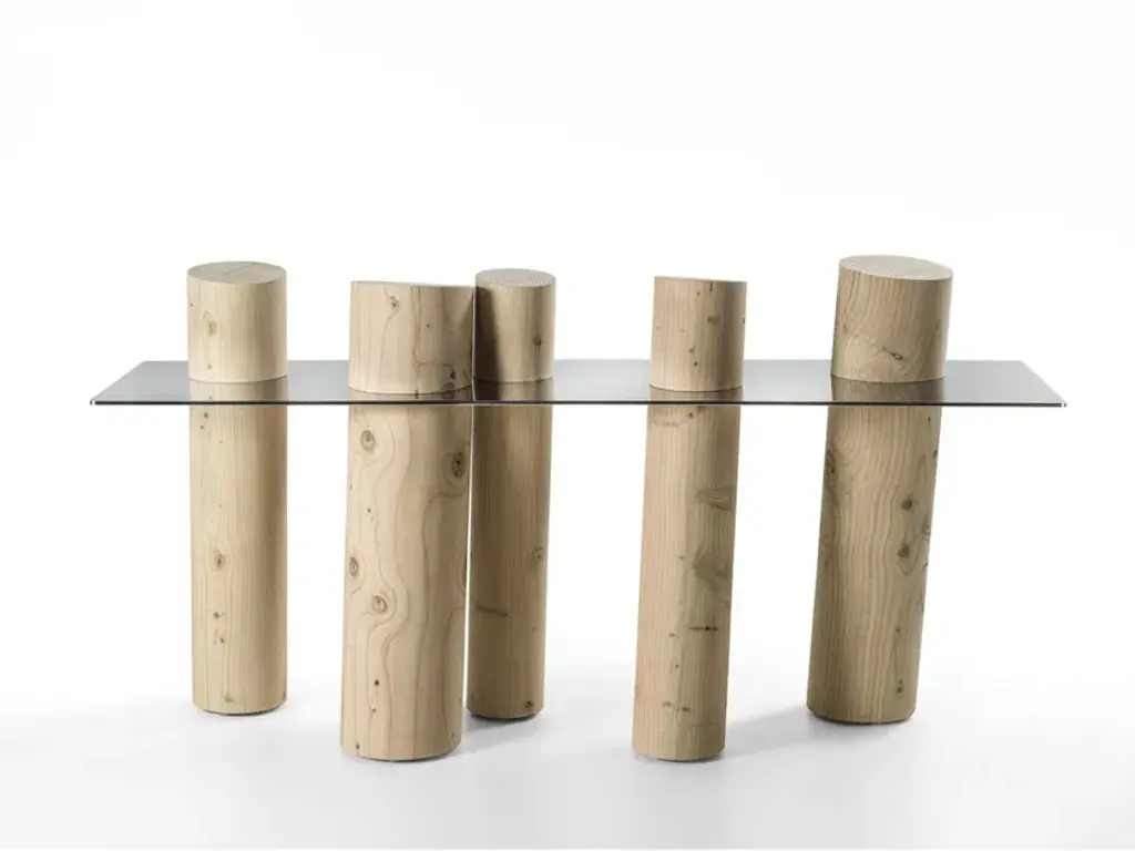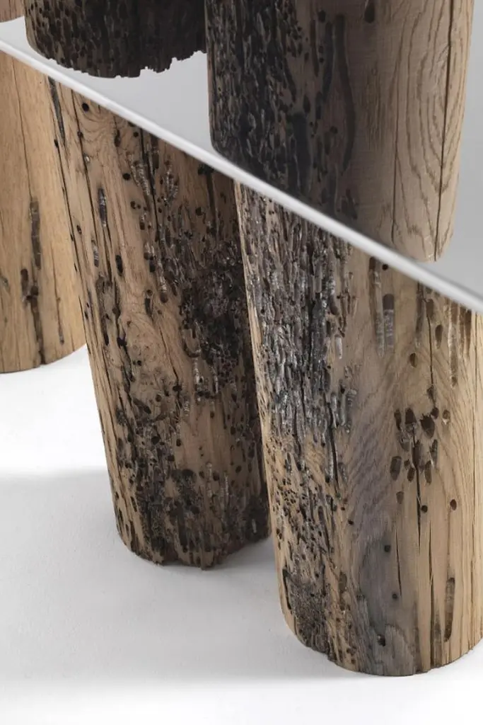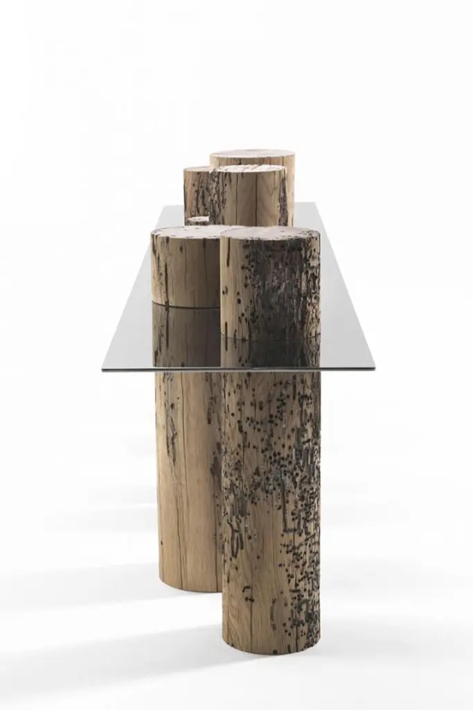 Console table Venise with smoked glass top 8mm thickness, base is made of six trunks in 250cm in solid oak wood from Venice canals columns.With smocked glass top 8mm, available in:L125 x D50 x H69 to 91cm, 4 trunks, price: 11500,00€L180 x D50 x H69 to 91cm, 5 trunks, price: 12500,00€L250 x D50 x H69 to 91cm, 6 trunks, price: 13900,00€Also available with clear glass top 12mm.