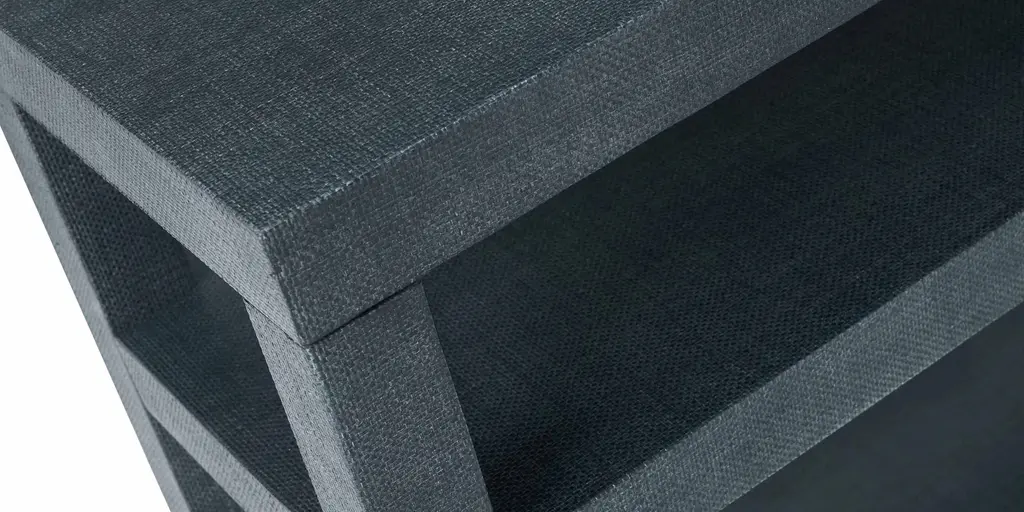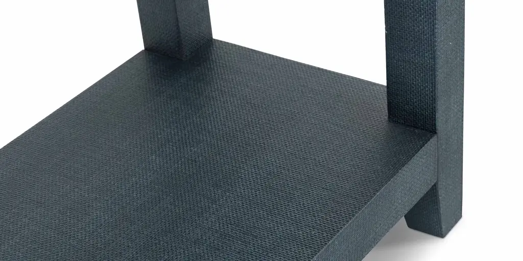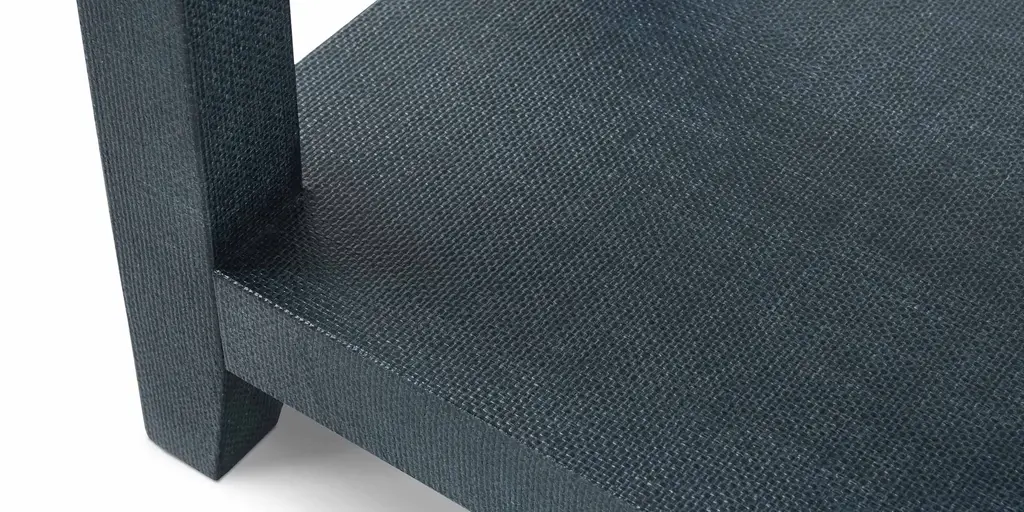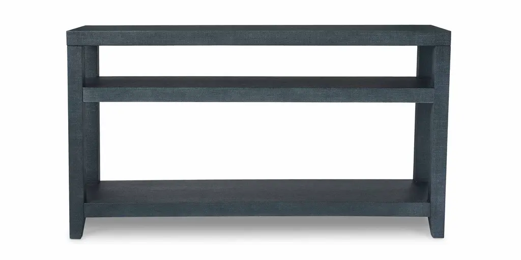 Theres something strikingly different about this Ventura console table - lightly textured raffia covering the entire table. Place it behind a sofa or along an entryway for a unique accent. Two sturdy lower shelves provide the perfect backdrop to display your favorite accents. Choose from Pacific Blue or Sand Grey.