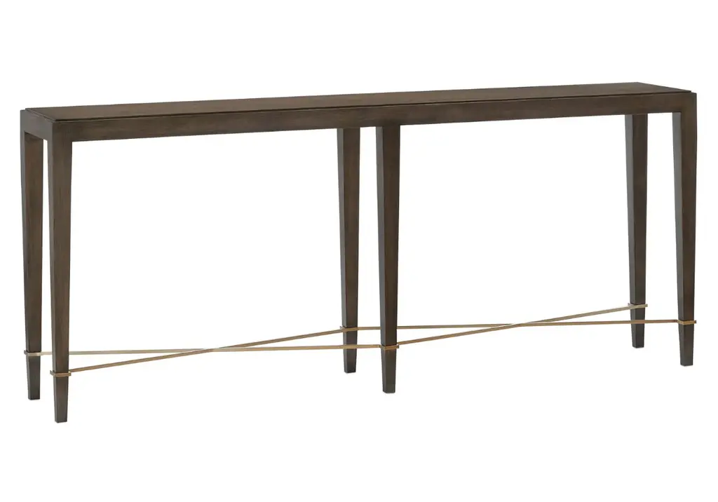 The Verona Console Table is a handsome addition with its elongated size and streamlined mahogany form. Its six tapered legs elevate it slim profile, complemented by a criss-cross champagne metal accent. Style along the back of a sofa, in an entryway, or in a living room for a graceful touch.