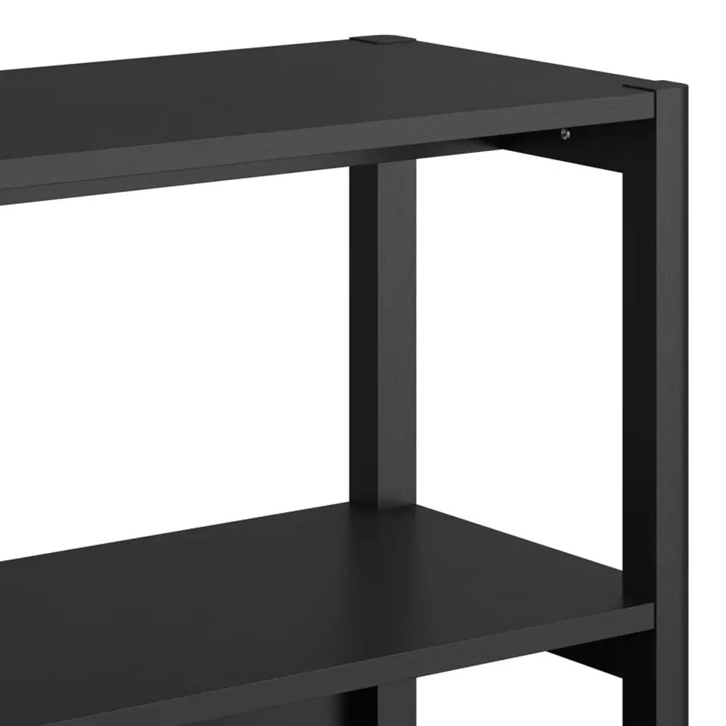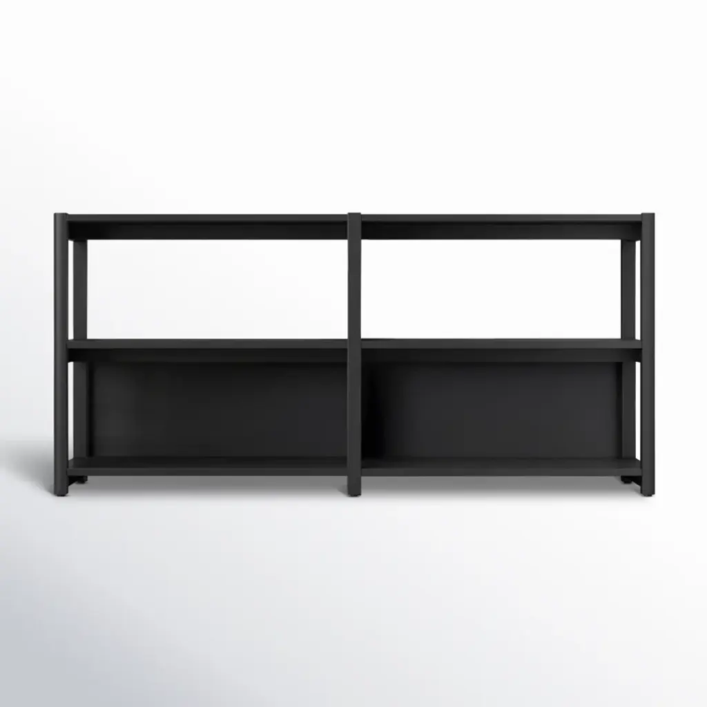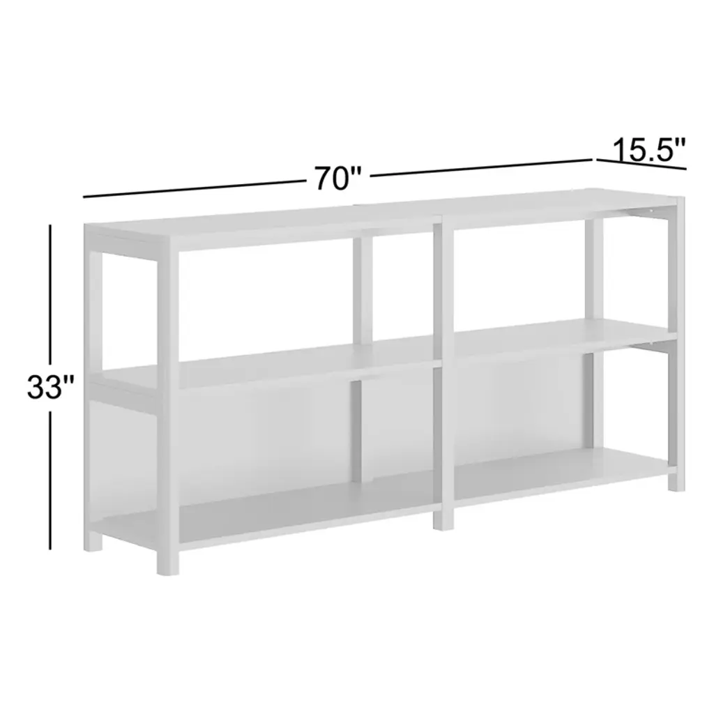 Cultivate a collection. Mixing open lines with natural wood grains, this bookcase organizes your library in a sleek, minimalist way. Made from solid wood, it features back panels on the lower shelf section, while the central shelf is open and airy. The horizontal design is ideal behind a sofa or as a console table substitute. And there's a lot of space on the rectangular top for décor or a pair of accent lamps.