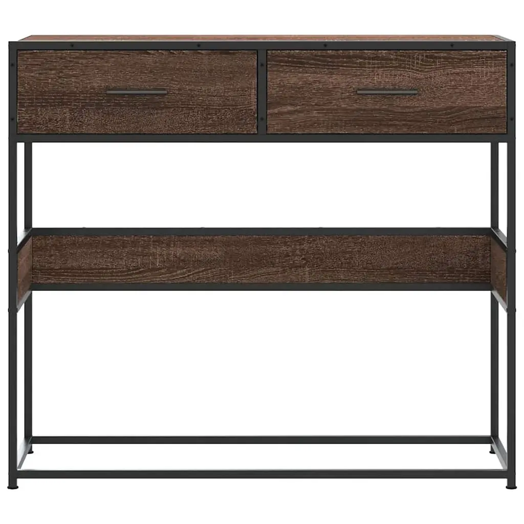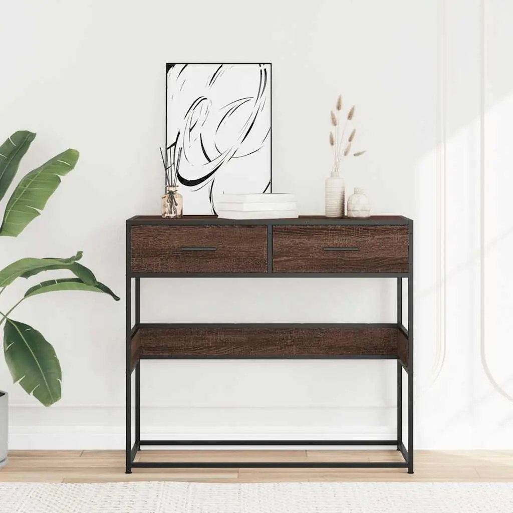 This industrial console table blends style with function, designed to perk up your space while handling your storage needs. It’s sturdy and has a lovely brown oak finish, fitting in nicely with both modern and traditional styles – perfect for entryways, living rooms, or hallways. Spacious Surface: This table's 35.4 in long surface is great for showing off your decor or for daily stuff like keys and mail.Concealed Storage: Fitted with two traditional drawers, each 16.5 in long, giving you plenty of space for keeping items neat.Strong and Durable: The solid engineered wood and metal frame ensure the table is tough and can handle some good weight.Stylish Aesthetic: The smooth matte finish paired with an industrial design makes a chic point of interest in any room.Safety Feature: Comes with a wall attachment that secures the table to the wall for stability and stops it from tipping.