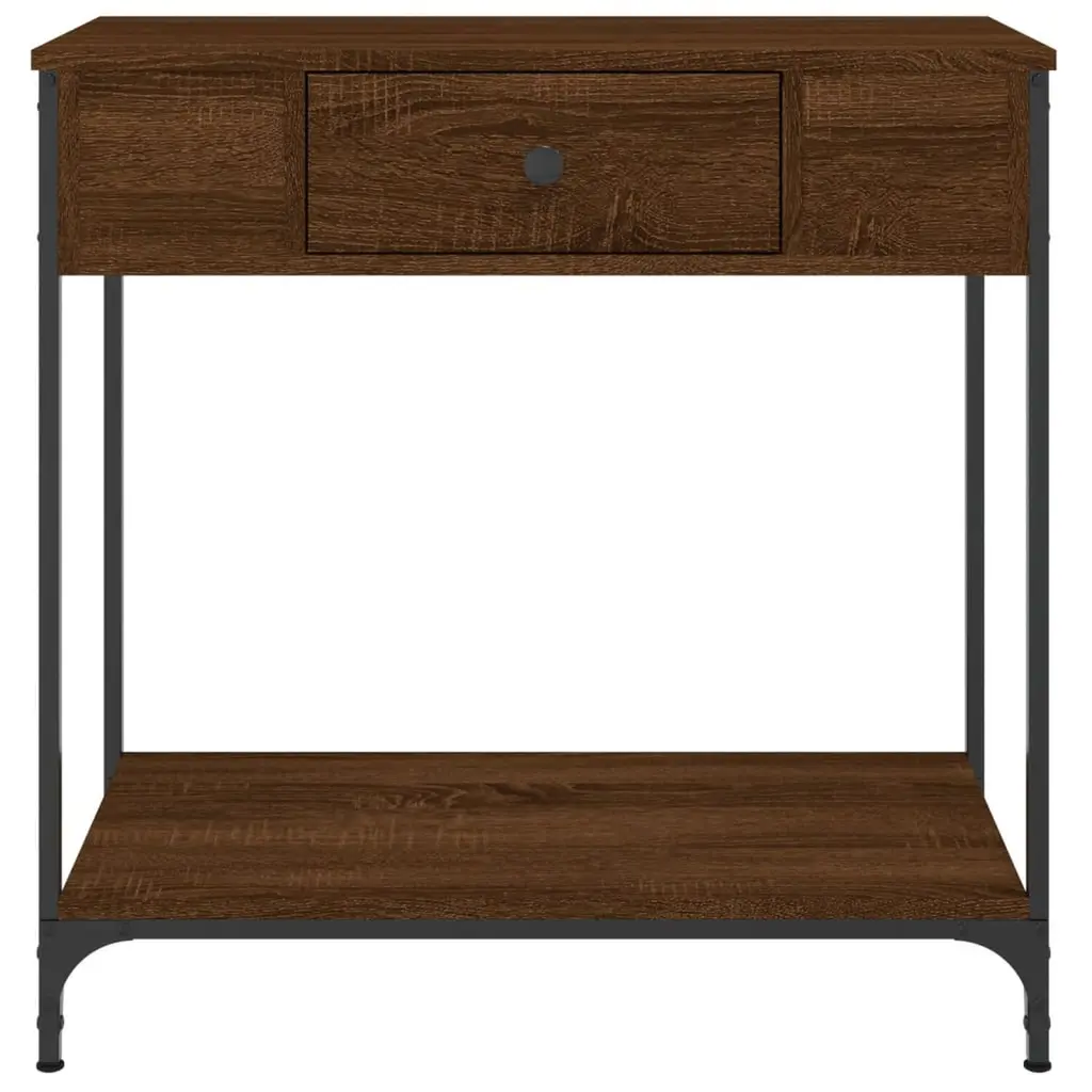 This console table merges modern industrial style with practicality, flaunting a warm brown oak finish that matches well in any room. Perfect for the entryway or living room, it stands out as both a decorative accent and a practical storage solution, showcasing sleek lines and a sturdy design in a space-saving rectangular shape. Elegant Aesthetics: The brown oak surface adds a classy touch to your decor, while the black metal legs create a bold contrast that’s visually striking. This combo lends a refined elegance that fits in with various home styles. Versatile Use: Whether you’re showcasing photos, plants, or using it as a handy storage spot, this table easily slips into hallways, living rooms, or entryways, emphasizing its multifunctionality. Functional Storage: With a roomy drawer, it makes organizing things like keys and small items a breeze, keeping your space tidy. Sturdy Construction: Built from engineered wood and metal, this console table is designed to last, with a robust design that withstands daily use while maintaining its stylish look. Easy Maintenance: The matte finish makes cleaning a piece of cake, so you can keep it looking great with just a damp cloth.