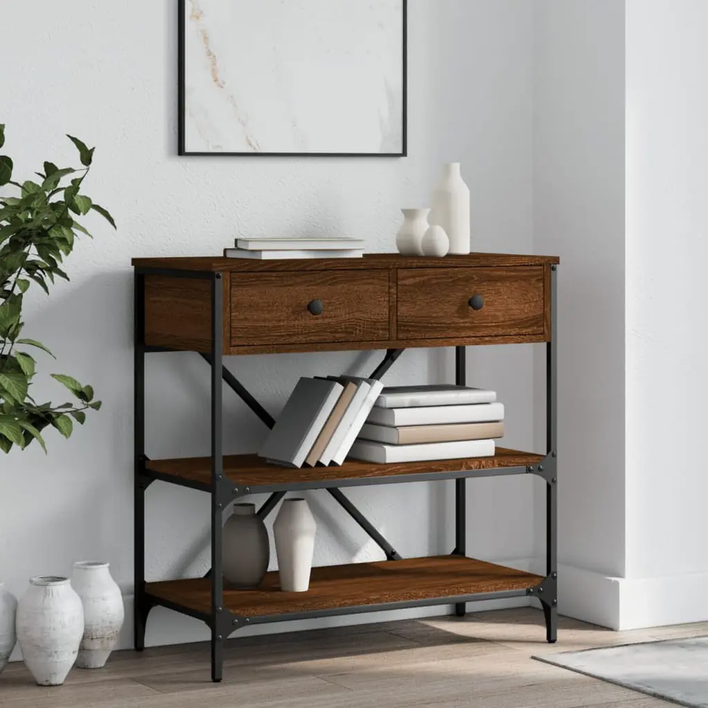 This console table marries form and function beautifully, making it just right for your living room, hallway, or bedroom. Made from engineered wood with a gorgeous brown oak finish, it offers plenty of storage while looking the part as both a decor piece and a practical item in your home. Lots of storage space to keep your items, decor, or must-haves organized.The strong metal frame boosts durability, keeping the table steady even with heavier stuff on it.This modern design flaunts sleek lines and a cool matte finish that'll match various interior styles.Versatile for different spaces like entryways, living rooms, or hallways—adding function across your home.Easy assembly with the included instructions, making it a piece of cake to set up.