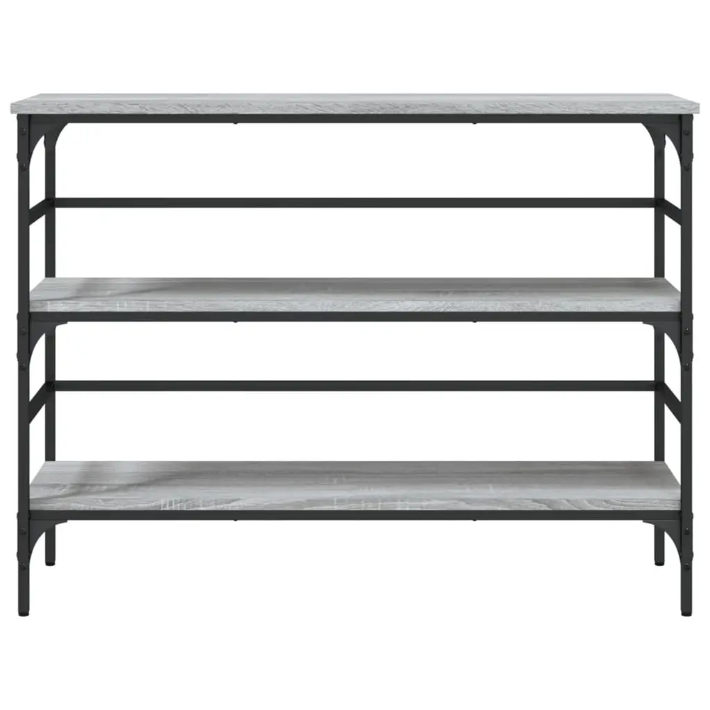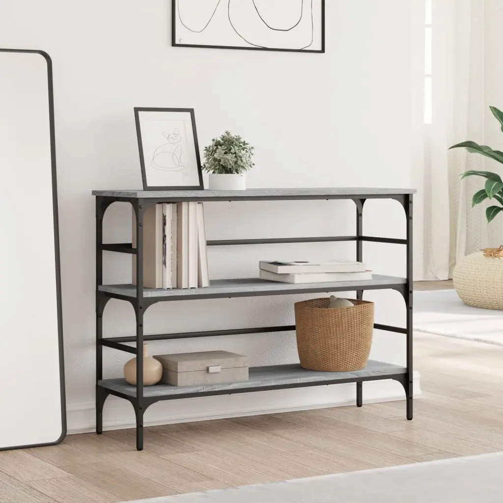 This console table is a perfect blend of practicality and industrial style, making it great for different living spaces. The gray sonoma finish gives it a modern feel, while the metal frame adds strength. It fits right into your hallway or living room, boosting both function and style. Loads of Storage: With three roomy shelves, this console table gives you plenty of space to show off your favorite decor items, books, or plants, making it easy to stay organized. Each shelf can hold up to 33 lbs, so you're good for both light and heavier items.Sleek Design: This table sports a modern industrial look that goes with any home style – whether that's modern, rustic, or eclectic. Its rectangular shape and neutral gray color make it an adaptable addition to your home.Durable Construction: Built tough with a sturdy metal frame and moisture-resistant engineered wood shelves, this console table's made to handle daily wear and tear. Its matte finish helps keep it looking fresh by hiding fingerprints and smudges over time.Adjustable Feet: The adjustable feet let you stabilize the table on uneven surfaces for a perfect setup in hallways, living rooms, or entryways. No more wobbling thanks to its solid base for everything you put on it.Easy Maintenance: A quick wipe with a damp cloth is all it takes to keep this console table looking good. Following the care instructions will help it last longer, plus use the wall attachment for extra security.