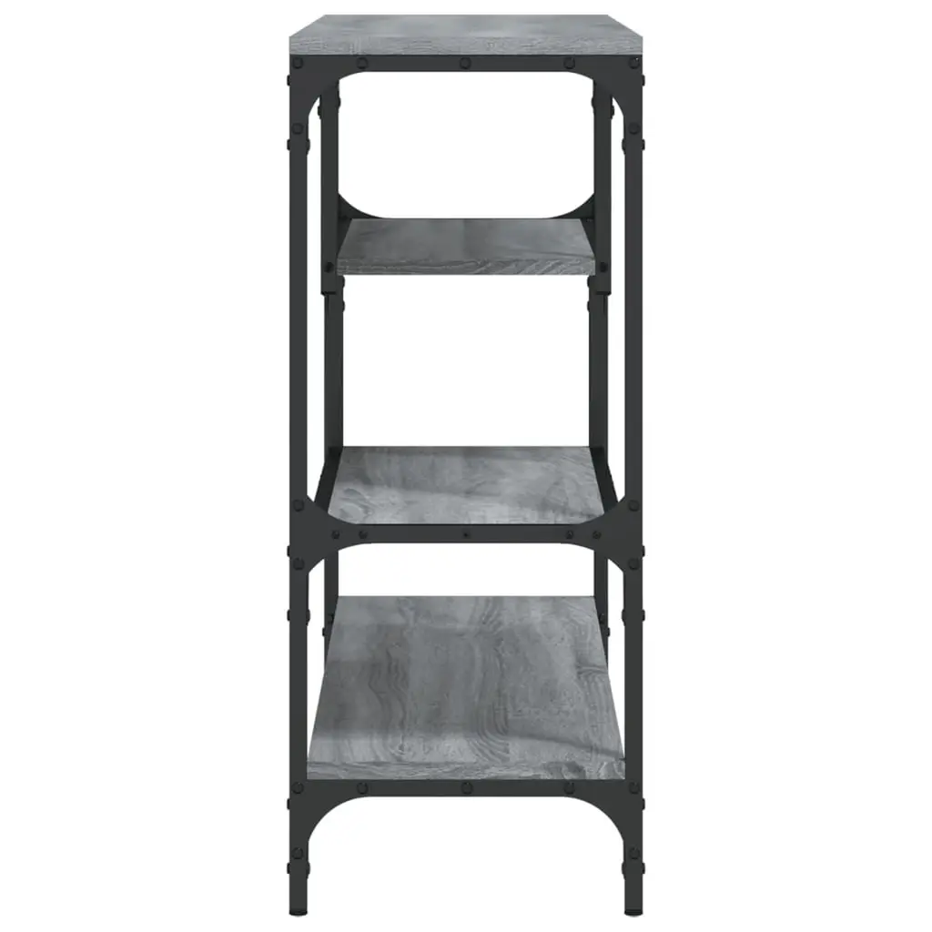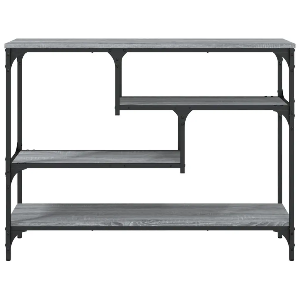 This console table is all about adding a cool industrial touch to your space, making it perfect for hallways, entryways, or living rooms. With its eye-catching Grey Sonoma finish and sturdy build, it combines function and style, fitting nicely with modern decor and giving you loads of room for your bits and pieces. Stylish Industrial Design: The console table features a rugged industrial style, with raw materials and a matte finish that elevates its visual interest. It's a smart pick for any space, blending right in with modern decor.Generous Storage Capacity: With three sturdy shelves, this table gives you plenty of room for books, decorations, and daily essentials. It keeps your space looking tidy while letting you showcase your favorite ornaments easily.Height-Adjustable Feet: The adjustable feet allow the console table to fit on all sorts of floors, providing stability even on uneven ground. This makes it a practical choice for any setting.Durable Construction: Built from engineered wood and robust metal, this table is not just stylish but also made to last. It stands up to daily use while keeping its great looks and usefulness.Wall Attachment for Stability: This console table comes with a wall attachment device, ensuring it stays securely in place – a key feature for safety and reliability.