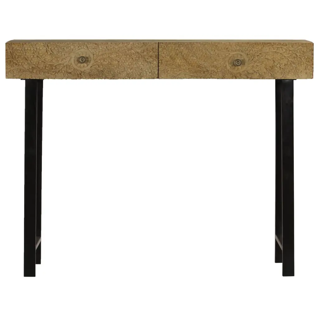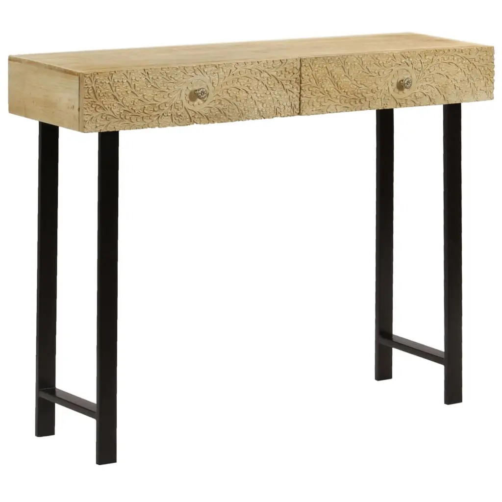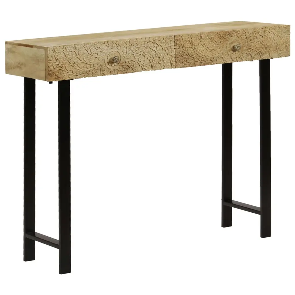 This rustic solid mango wood console table is a versatile piece, perfect for sprucing up any room. With its natural, textured finish and hand-carved decorative elements, this console table blends function with style, making it a gorgeous addition to your living room, bedroom, or entryway. Ample Storage Space: The console table has two spacious drawers, perfect for stashing keys and mail to keep your living area tidy.Hand-carved Pattern: Each piece has its unique hand-carved designs, showcasing the quality of the solid mango wood.Sturdy Metal Frame: Built with a strong black steel frame, this console table is stable and can handle daily use while still looking stylish.Multi-use Functionality: This handy console table can display your favorite items or photos, or simply serve as a functional table to greet guests.Easy Maintenance: With its lacquered finish, this console table is a breeze to clean and keeps looking good for years.