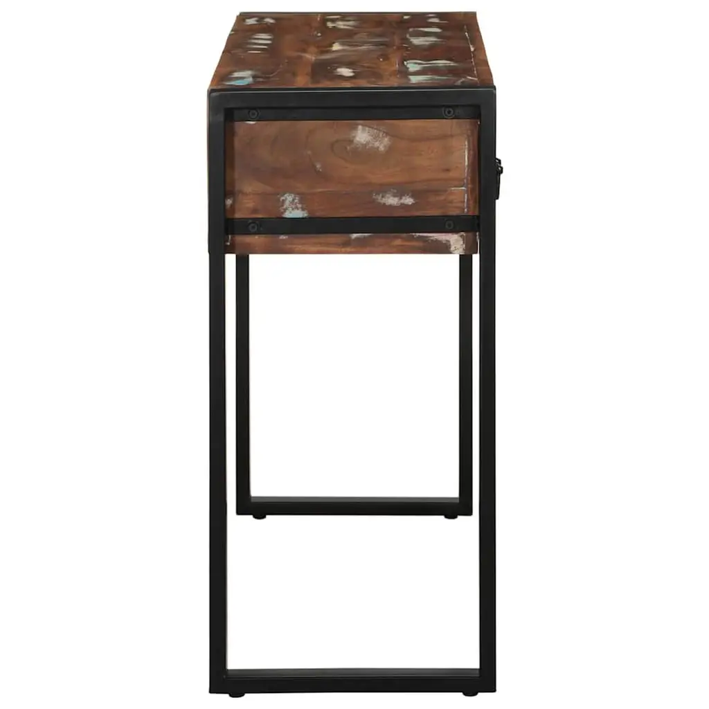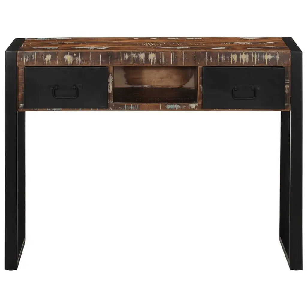 This console table mixes rustic charm with practicality, making it an essential piece for your living space. Made from solid reclaimed wood, this multicolour table brings a touch of nature inside while giving you handy storage and display options for your stuff. Spacious Storage: The table boasts two drawers made of solid reclaimed wood, giving you plenty of space for keys, mail, or decorative items. Stunning Aesthetic: Its rustic finish showcases the unique textures and tones of reclaimed wood, making each table a one-of-a-kind feature. Multi-Functional Use: Designed for versatility, this console table works as an entryway table, sofa table, or a stylish display unit for living spaces. Sturdy Frame: The strong construction promises durability, featuring a solid wood frame and a sleek black matte finish on the legs for a modern touch. Ideal Size: At 39.4 inches long, 13.8 inches wide, and 29.5 inches high, this table fits well in narrow spaces while also giving you the necessary surface area for decoration and storage.