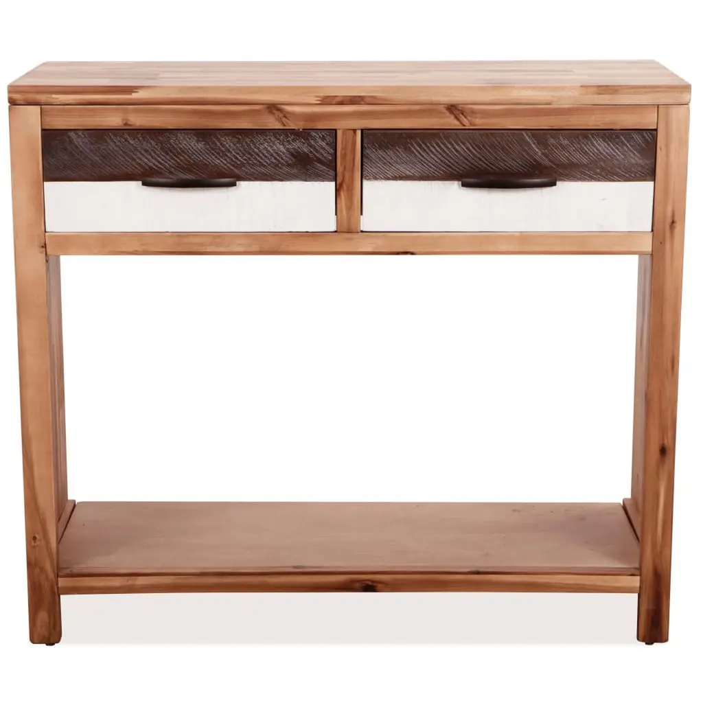 This rustic console table is made with solid acacia wood, showing off a lovely natural finish that brings warmth and character. It’s a smart choice for any hallway, living room, or entryway, mixing function and style while being a striking focal point in your home décor. Ample Storage: The console table gives you loads of storage options, perfect for keeping your essentials organized. With three compartments, you can tuck away shoes, keys, or decorative items, keeping them within reach yet out of sight.Durable Build: Made from solid acacia wood with a lacquered finish, this piece stands the test of time, offering sturdy support and keeping its good looks. The natural grain patterns give it unique charm, meaning no two tables will look the same.Decorative Inlays: The contrast of the drawer fronts with decorative inlays gives the table a distinct personality, turning a functional piece into artwork that enriches your space. This attention to detail shows off the craftsmanship.Versatile Usage: This console table is great in all sorts of settings and can double as a display surface for art, photos, or plants, making it a multifunctional addition to your home. It fits in with any décor style, increasing its value.Easy Care: Keeping this console table looking wonderful is easy; just wipe it with a damp cloth. Avoid harsh chemicals to ensure it lasts long and its beautiful finish stays fresh with minimal effort.