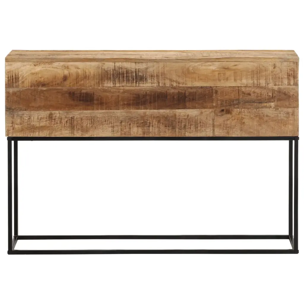 This Solid Mango Wood Console Table stands out in modern homes, featuring a unique industrial design that brings a natural vibe with its earthy, rough mango wood finish. Measuring 43.3 in long, this console is super versatile: whether you're welcoming guests in the entryway or showcasing your latest decor in the living room, it fits right in with both contemporary and rustic styles, delivering functionality without losing its charm. Sturdy Construction: Made from solid mango wood and tough iron legs, offering stability for your decor.Industrial Style: This table has a striking design that showcases natural materials and catches the eye in any room.Multiple Uses: Perfect as an entryway table, hallway display, or in the office; this piece fits anywhere.Easy Maintenance: The matte metal finish pairs well with the mango wood, needing just a quick dusting or damp wipe to keep it looking good.Compact Design: At 43.3 in x 11.8 in x 29.5 in, this narrow console is perfect for tight spaces, making it a fantastic option for any home.