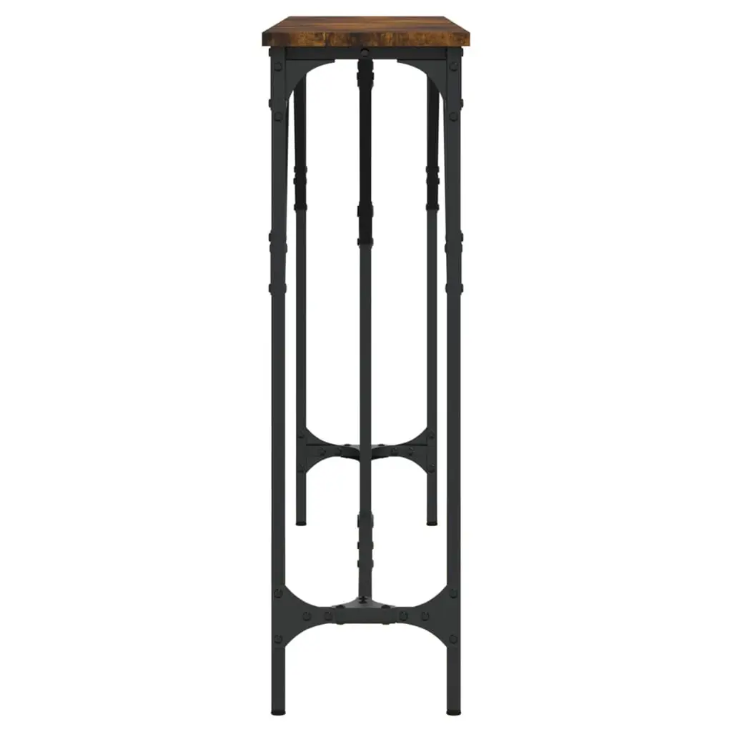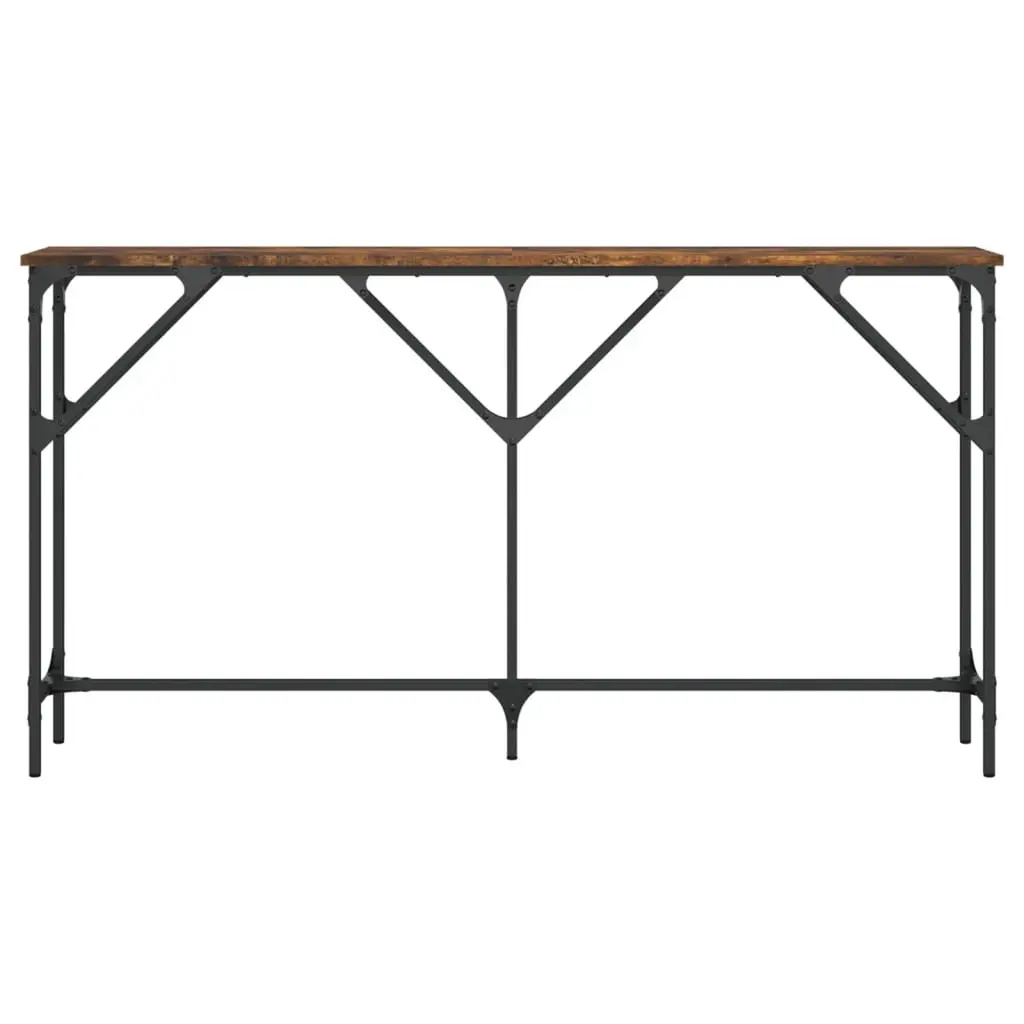 This console table is a versatile and stylish piece that fits perfectly into modern or industrial decors. Made from sturdy smoked oak engineered wood, it has a sleek black steel frame that adds a touch of elegance while keeping things durable—perfect for entryways and living rooms. Adjustable Feet: These keep the table stable, whatever the floor's like. Great for homes with uneven flooring, stopping it from wobbling.Industrial Design: A tough, factory-style vibe, the console table nails that minimal aesthetic that works in any home or office. Plus, the matte finish cuts glare while looking fab.Spacious Surface: With 55.1 in long and 9.1 in wide, this table gives you plenty of room for showing off decor, holding keys, or just keeping everyday essentials handy.Durable Materials: Made from top-notch engineered wood and a sturdy steel frame, this console table is built to last while staying stylish.Easy Assembly: All tools for putting it together are included, making setup quick and painless.