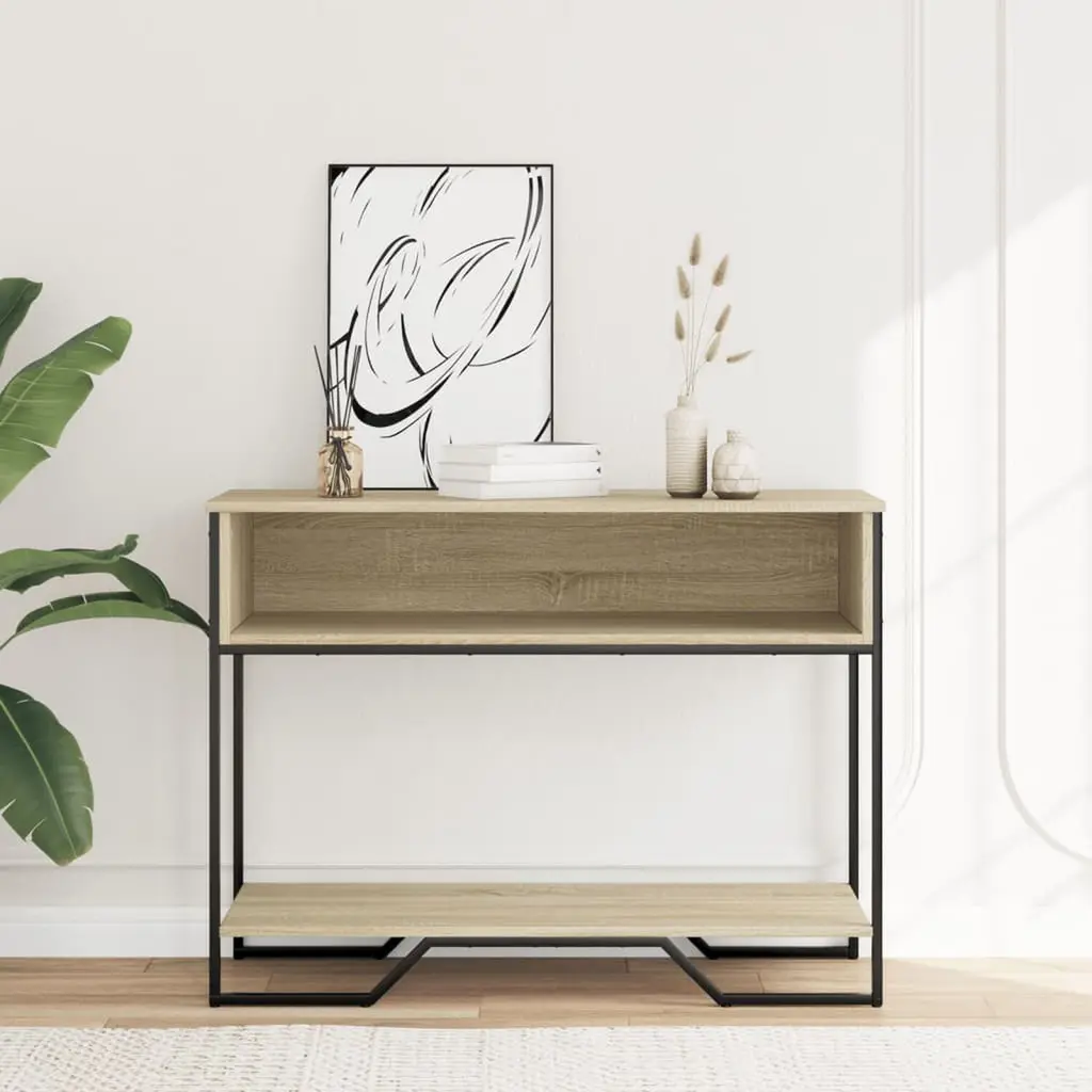This console table looks fantastic in any living room or hallway. Made from engineered wood with a beautiful Sonoma oak finish that adds warmth and style. The smooth matte surface modernizes the look while providing ample space to display items, plants, or store essentials in a hallway or entryway. Spacious Surface: The tabletop measures 39.4 in long and 13.8 in wide, perfect for showcasing picture frames or other decor that brightens your space.Quality Materials: Made from moisture-resistant engineered wood, this console table is not only attractive but also resilient against everyday wear and tear.Stylish Design: With sleek lines and a modern feel, it compliments various decor styles while standing out as a smart choice.Stable Structure: Strong enough to support up to 132.3 lbs, it’s solid and safe for a range of items.Easy Assembly: Comes with simple instructions and requires minimal tools for setup, so you can enjoy your table in no time!