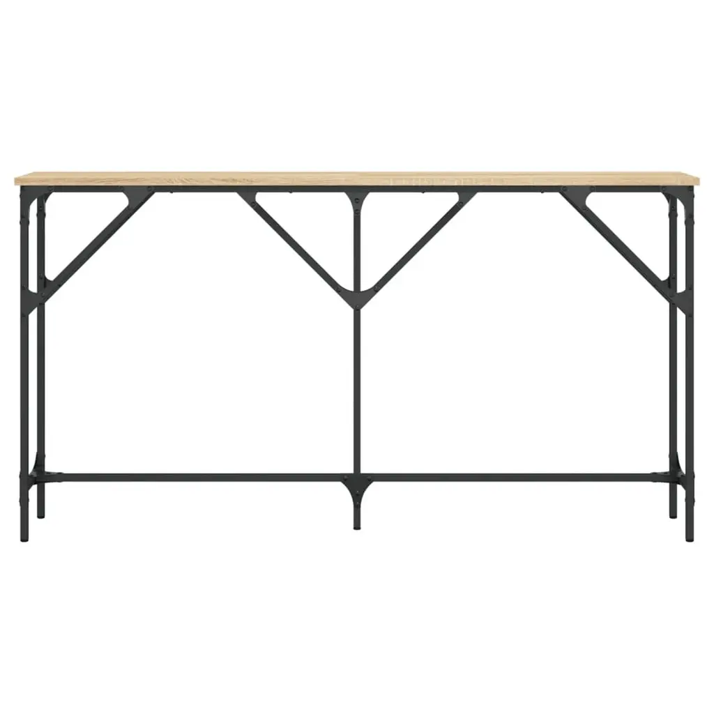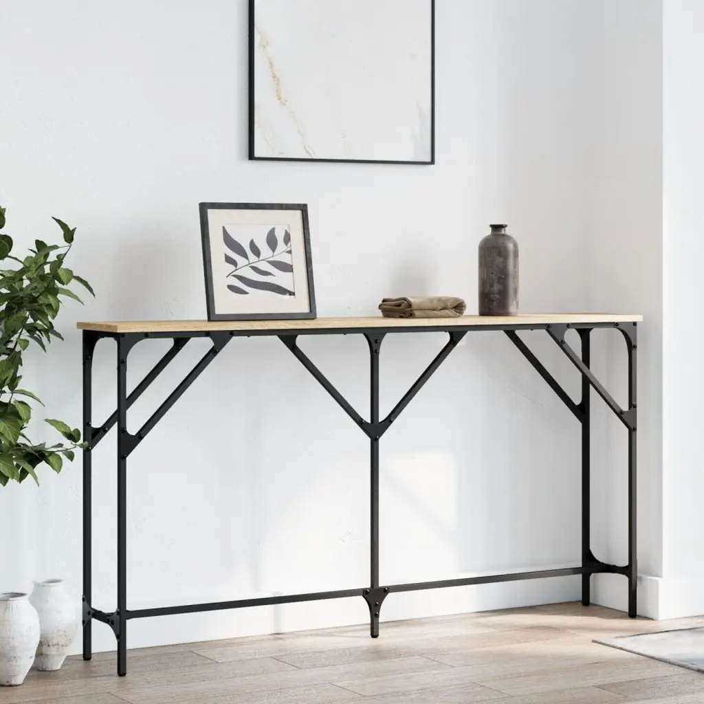 This Console Table is a fab centerpiece, perfect for making your living space shine with its Sonoma Oak finish. The mix of engineered wood and metal creates a slick yet sturdy design, ideal for both modern and industrial looks, while providing loads of space for decorations, photos, or daily essentials. Stylish Appearance: The Sonoma Oak table gives off a warm, rich vibe that works with any style of decor.Robust Frame: Built with a solid metal frame for durability and support for all sorts of items.Adjustable Feet: Comes with height-adjustable feet to keep it steady on uneven floors.Ample Surface Space: With dimensions of 55.1 x 9.1 in, it has plenty of room for plants and decor.Easy Maintenance: Just wipe with a damp cloth to keep it looking good as new.