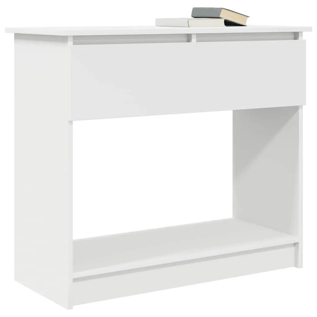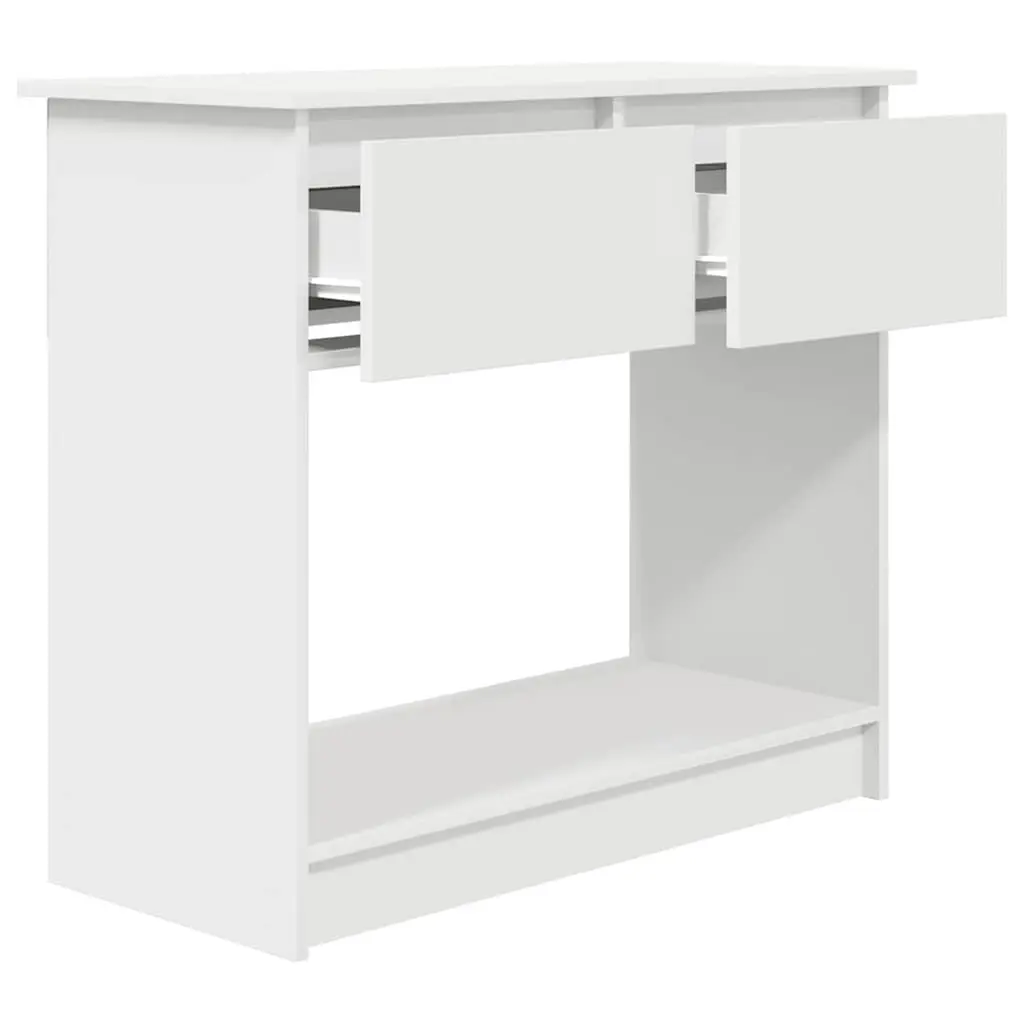 This console table is a stunning addition to any home, blending style and practicality. With its trendy design, it slots in nicely in entryways or living rooms, providing plenty of surface for decorative bits, keys, or photo frames, making it welcoming for guests and handy for daily use. Ample Storage: Keep your space organized with two roomy drawers, making it easy to grab what you need.Durable Construction: Made from quality engineered wood, this console table is built for long-lasting use, standing up to everyday wear and tear.Seamless Aesthetic: Its sleek white finish brings a touch of class and fits in with various decor styles, making it an adaptable piece.User-Friendly Design: The drawers have shiny metal knobs, making them a breeze to open and close for your everyday needs.Perfect Dimensions: With dimensions of 33.7 in long, 15.2 in wide, and 29.3 in high, this console table fits perfectly in small spaces while offering great usability.