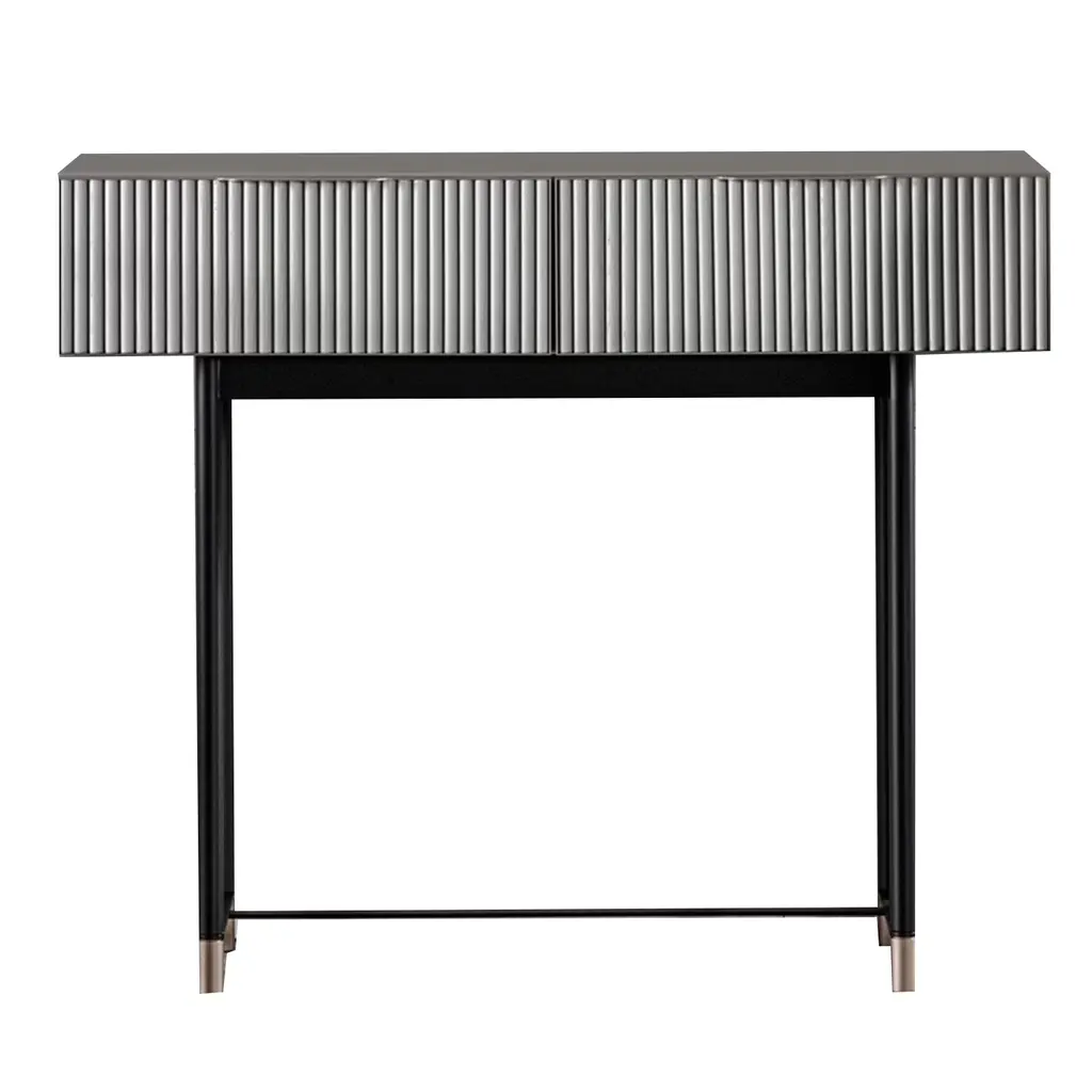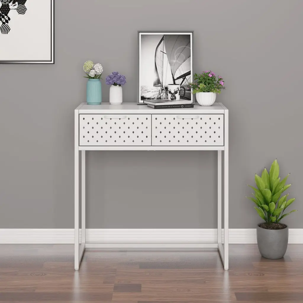 This console table is a stylish addition to any modern space, combining great looks with practical use. Ideal for hallways or living rooms, its clean lines and white finish add a nice touch to any room. Stylish Design: The sleek structure of this console table features a stunning white finish that fits effortlessly into various decors, giving your entryway or living area a modern vibe. Its simplicity allows it to shine without taking over the space. Functional Storage: With two roomy drawers, this console table helps keep smaller items organized and easy to get to, making it great for entryway essentials like keys and letters. Having a specific spot for things keeps your space looking tidy. Durable Construction: Made from high-quality steel, this console table is built to last. The solid material ensures it can handle everyday use while looking good enough to blend in. Adjustable Feet: Featuring adjustable feet, this console table can be set to sit flat on uneven floors, making it stable and safe no matter how your room is laid out. This is especially useful in homes with different flooring types. Expandable Features: This console table isn’t just pretty; it’s practical too! With ball-bearing runners, the drawers glide open effortlessly, even when fully loaded. Perfectly balancing beauty and functionality, it makes a fantastic addition to any room.