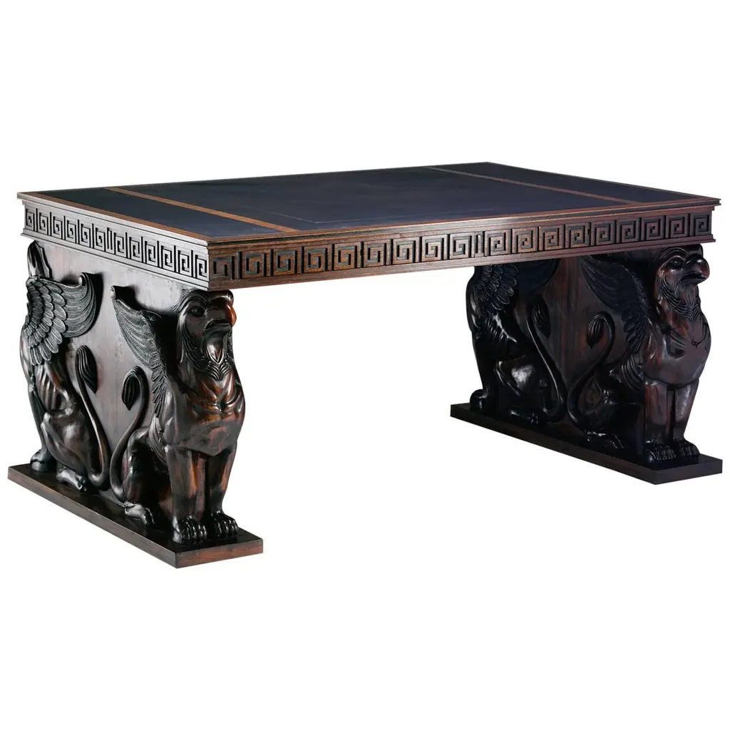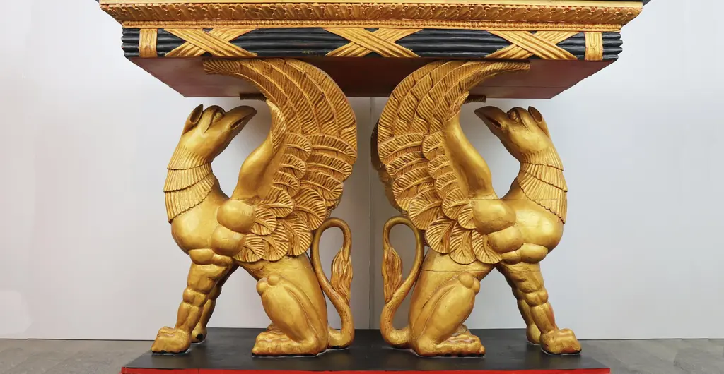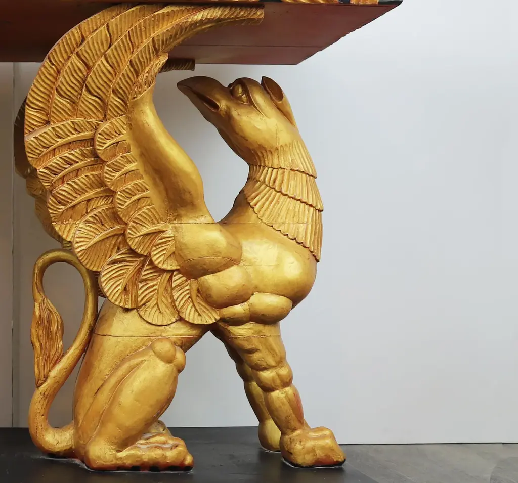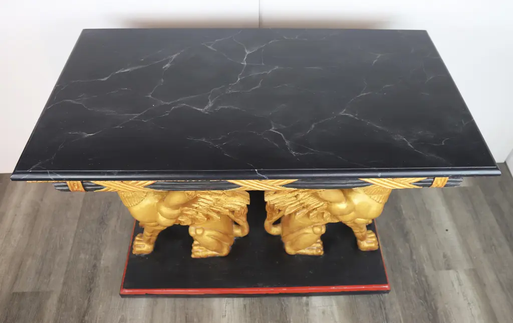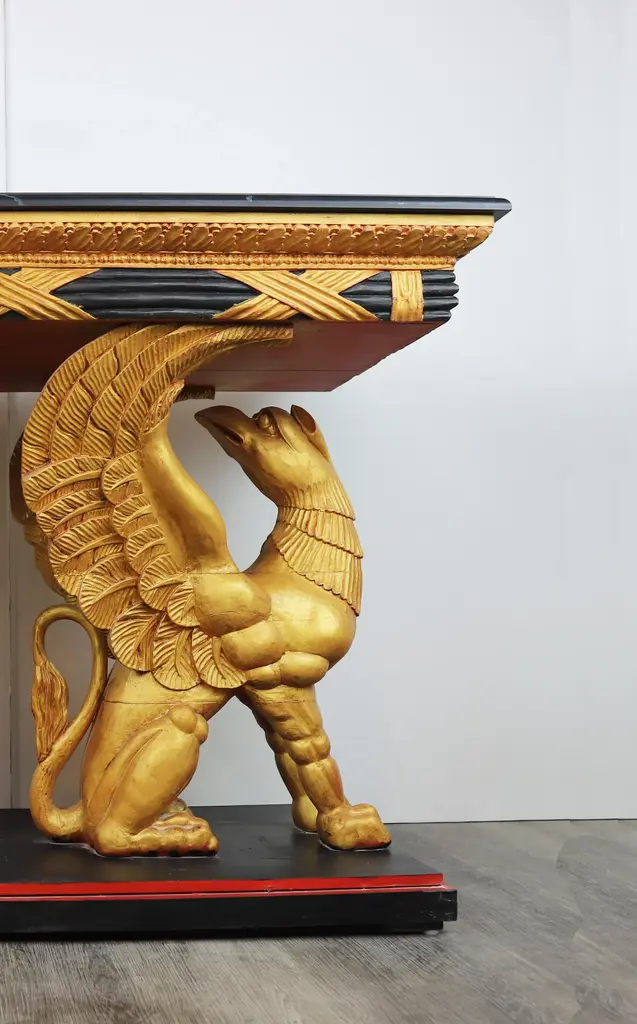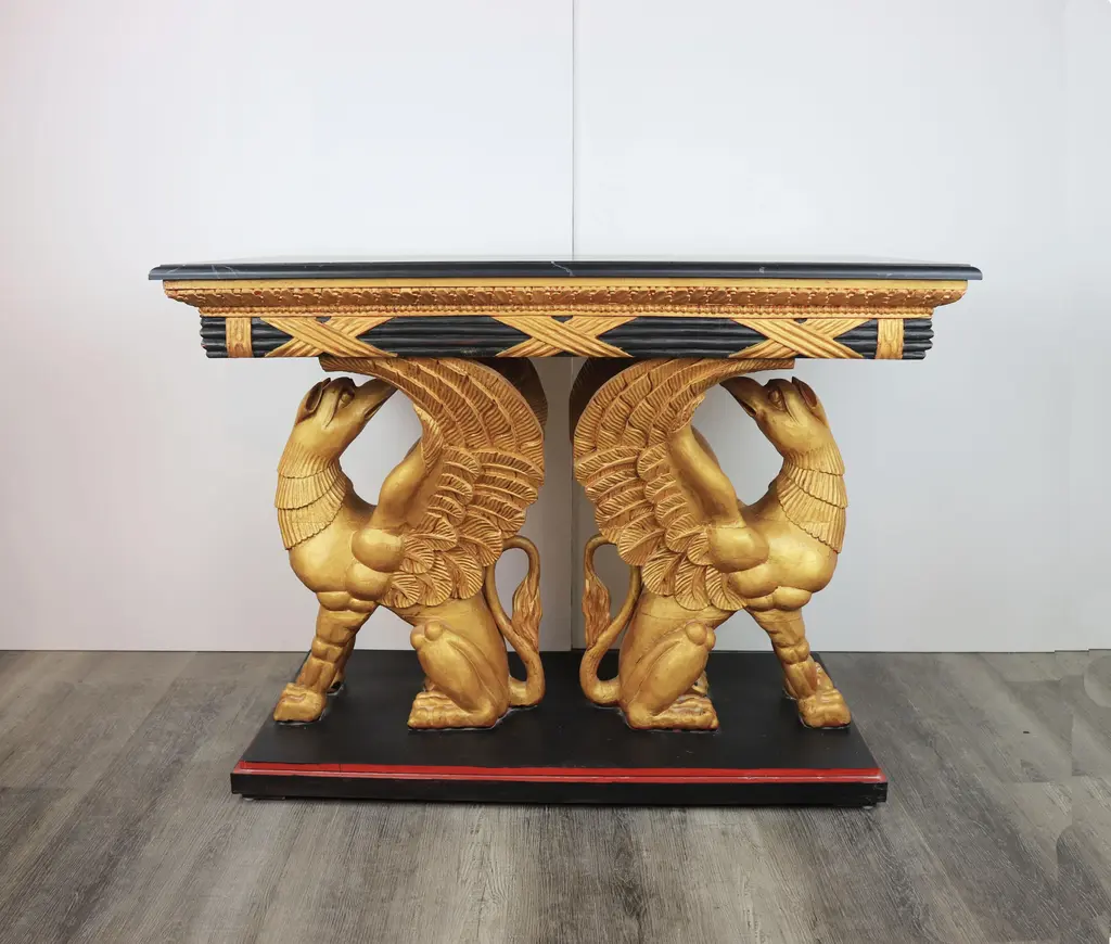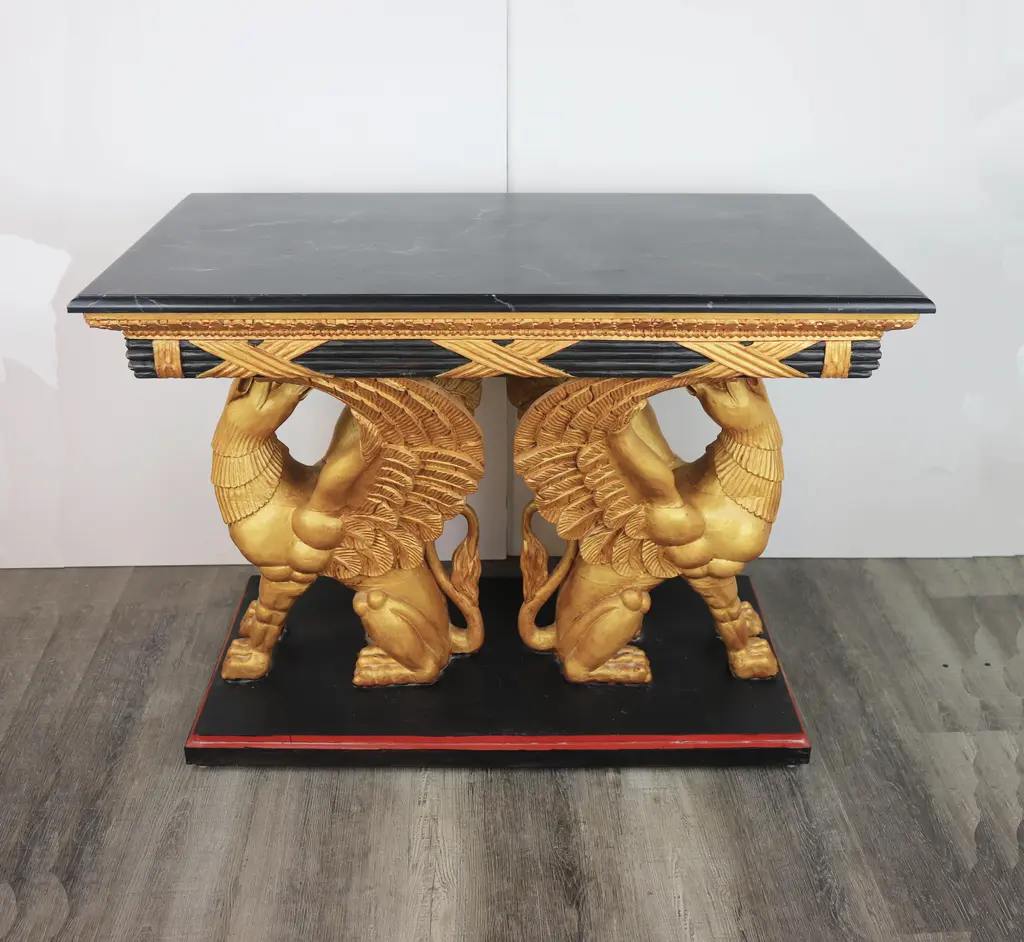 vintage Gilt Gryphon Also Known As "Griffin" .19Century Carved Giltwood Console Table.Supported by two sculptures Griffin (part eagle, part sea creature) The griffin (Ancient Greek: γρύφων) is a legendary creature popular from West Asia to the Mediterranean Sea. It has the body of a lion and the head, beak and wings of an eagle. Because the lion and the eagle dominate the land and the sky respectively, the Gryphon is regarded as a symbol of power and dignity。 42" * 23" * 31.5"
