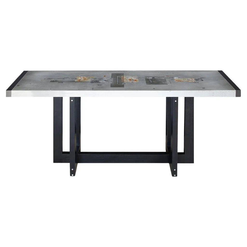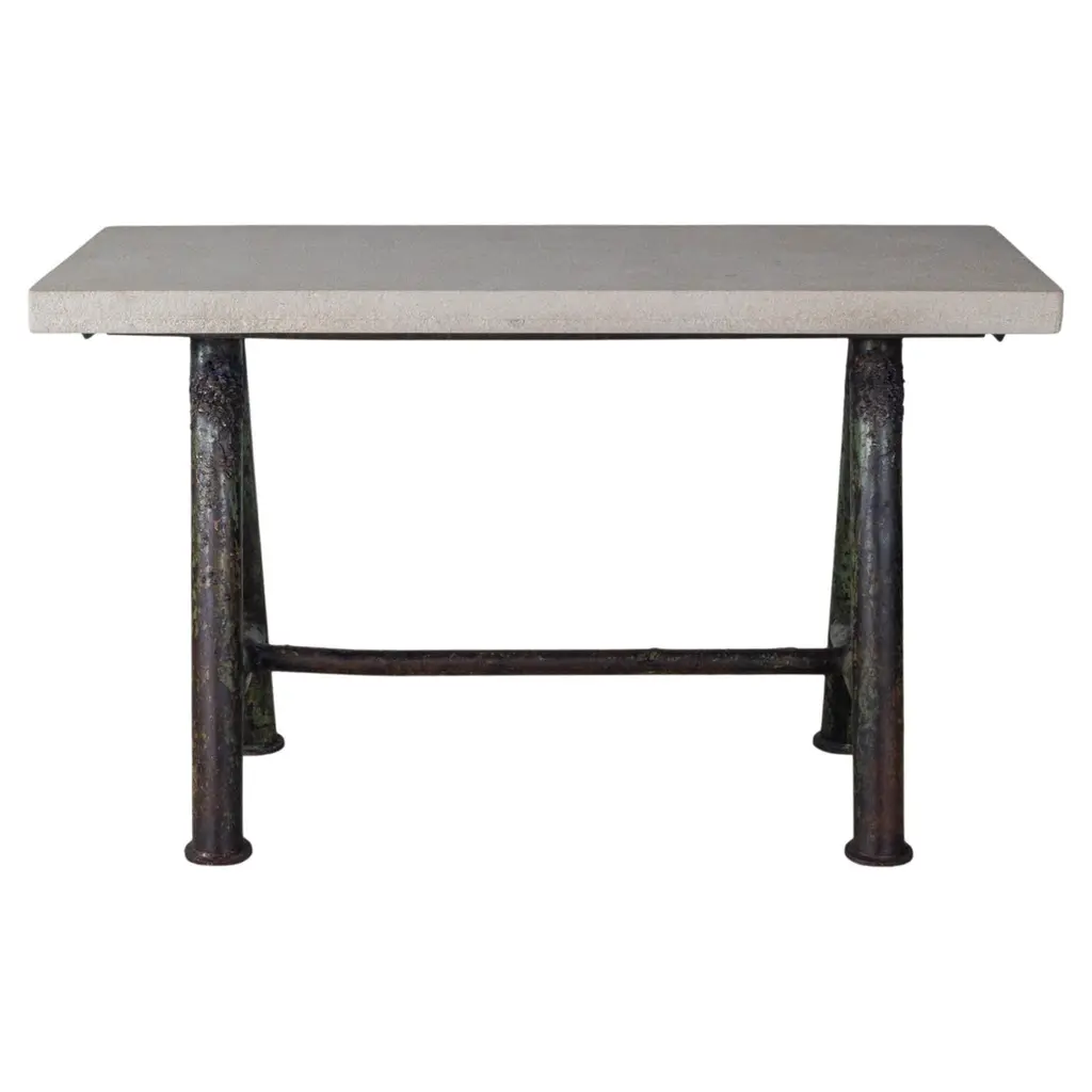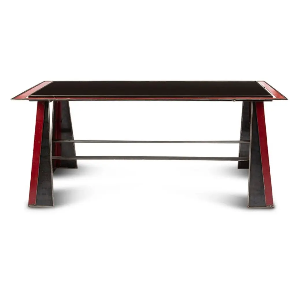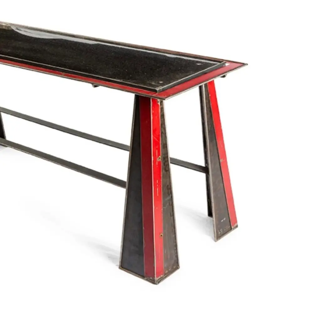 This vintage metal console table blends Art Deco influences with industrial charm. The linear frame is accented by red and black painted detailing, with a naturally aged patina and authentic distressing that add character and depth. The bold yet minimalist silhouette makes it a versatile piece—perfect behind a sofa, in an entryway, or as a statement display table. Wear is consistent with age and use. See photos for details.67” W x 23” D x 29.5” H