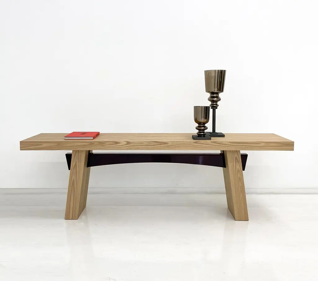 WA 240 Matt Elm And Glossy Oxblood Beam Rectangular Console by Casa Casati Dimensions: D 120 x W 380 x H 74 cm. Materials: Lacquer, MDF, and elm.Available in different materials and size options. Please contact us.A console of generous proportions with a distinctly thick top and angled legs, its sleek design enhanced and enriched by the curve of its contrasting lacquered beam. Designed in Elm wood with a dark-red gloss-lacquered beam, the WA console is also available in the entire range of woods and lacquered finishes present in the CASA CASATI collection.Atelier Casa Casati. Italian Lifestyle. Italian Skill. Italian Furniture.Excellence of materials, love of detail, creativity. This sums up the design philosophy of CASA CASATI. The atelier was created in 2016 by architects Bosco Fair and Emanuele Genuizzi, who, following years of experience in the field of interior and product design, bring to this project the cultural and aesthetic values of the highest Italian tradition. A tradition that takes form thanks to the work of the most qualified artisans of Brianza. It is in their hands that the “Italian Dream” becomes reality. It’s their skill which gives life to unique pieces, characterized by precious materials, sophisticated finishes, and unusual combinations which never fail to surprise. Thanks to the use of natural materials and expert manual labour, each of the CASA CASATI pieces has its own ethos, showing specific characteristics which highlight their value as unique pieces. Special interior projects and limited edition pieces can be developed upon request.CASA CASATI: classic elegance and a contemporary aesthetic mix together to create something indisputably of its time.