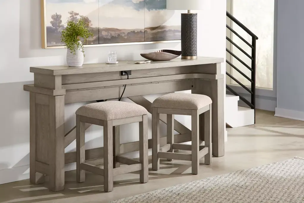 Add additional seating and tablespace with our contemporary Wakefield console table. Featuring a driftwood grey finish and convenient electrical outlet and USB-C port, this table is both stylish and functional. Can be purchased as a bundle with Wakefield stools.