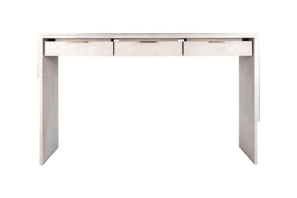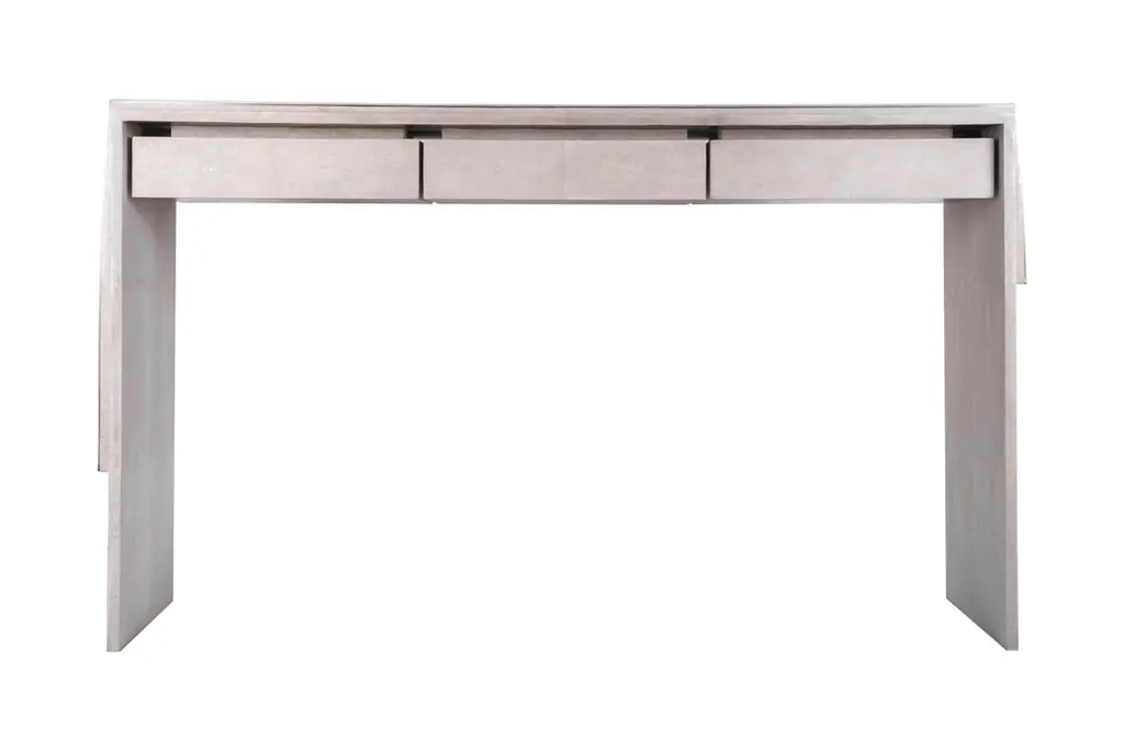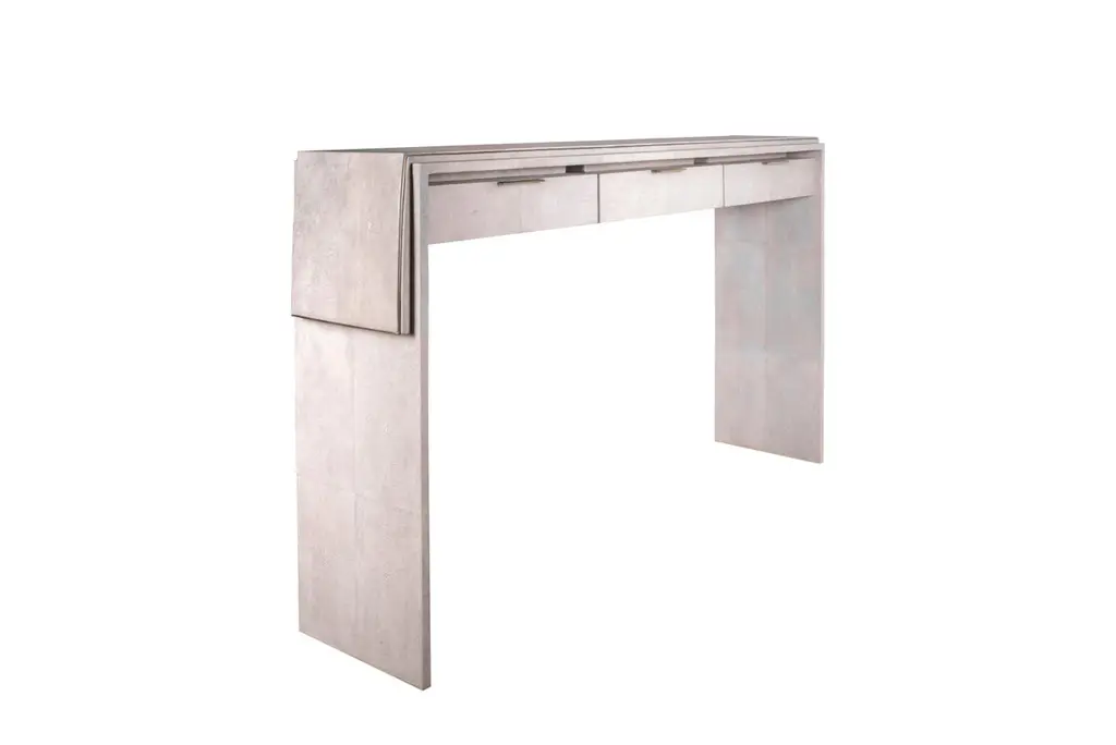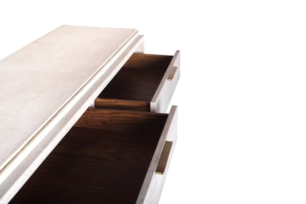 The Paris based label has distinguished themselves since their launch, with their iconic use of shagreen mixed with brass and other exotic materials. All furniture is handcrafted by skilled artisans, ultimately making each piece unique, designed in Paris and produced in the Philippines.The Waldorf console by R&Y Augousti is an elegant piece with it's asymmetric overlay detail in cream shagreen and the discreet bronze-patina brass metal indentation detailing. This piece includes three drawers that appear as though they are floating with thin bronze-patina brass handles, and inlaid inside with a wood veneer. The shagreen us hand-dyed by artisans and the designer calls this finish ''antique natural'' shagreen. Custom color and sizing available on request.The dimensions of this piece are 154 x 34 x 90 cm / 60.5 x 13.5 x 35.5''All R&Y Augousti pieces are handmade by artisans, ultimately making each piece unique. Wipe clean with soft dry cloth.Acclaimed design duo Ria & Yiouri Augousti have established themselves since the 1990s as pioneers of modern-vintage style through their luxurious Art Deco inspired collections.The Paris based label has distinguished themselves since their launch, with their iconic use of shagreen mixed with brass and other exotic materials. All furniture is handcrafted by skilled artisans, ultimately making each piece unique. All shagreen-covered items should be kept out of direct sunlight, color variants may occur on the stingray and other exotic finishes, but this showcases the Parisian label's commitment to creating authentic luxurious products using natural components.