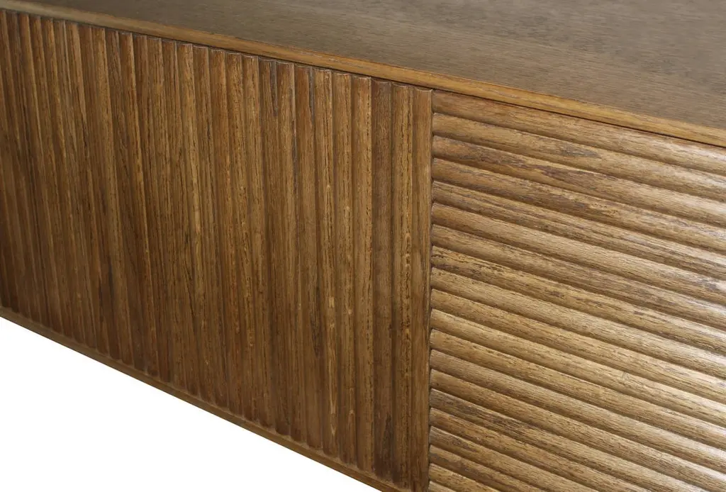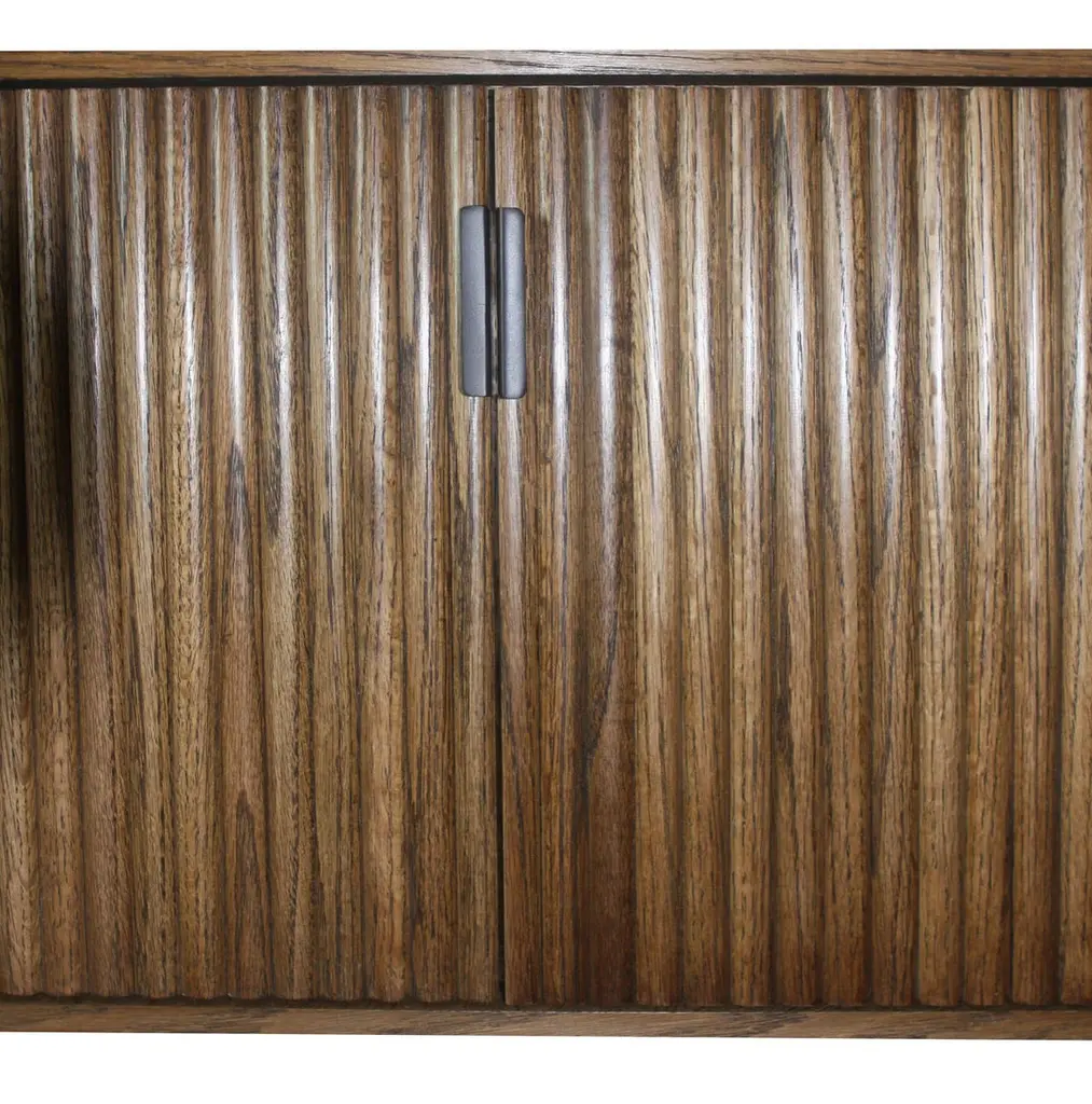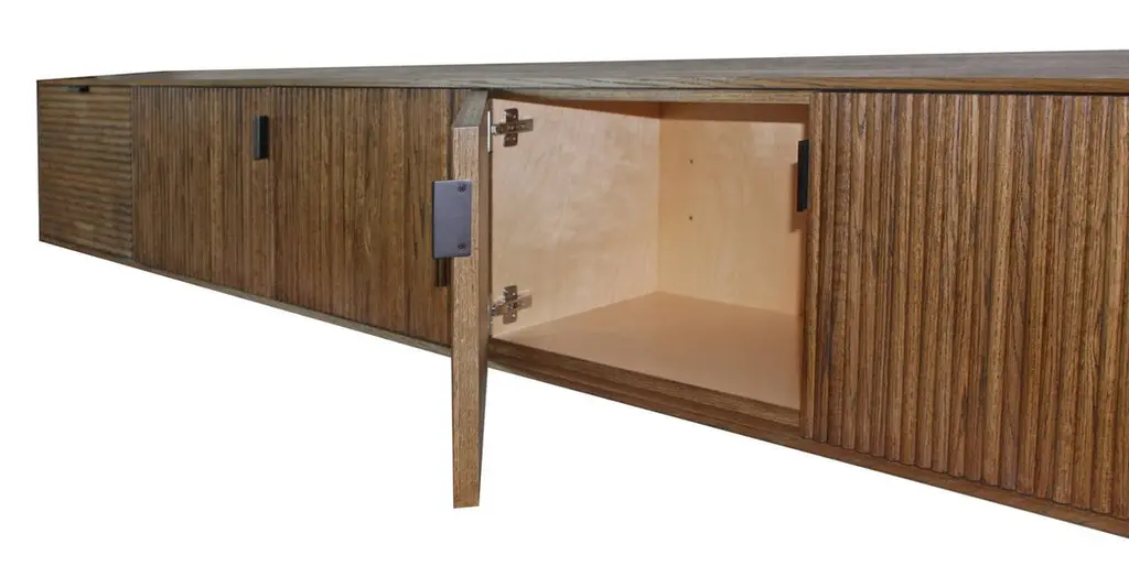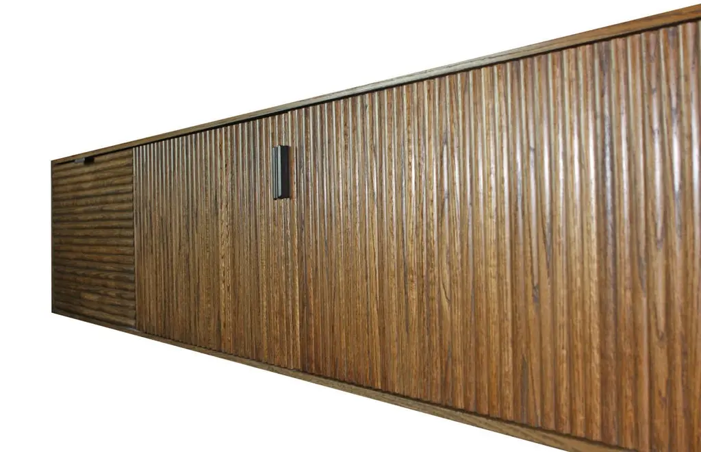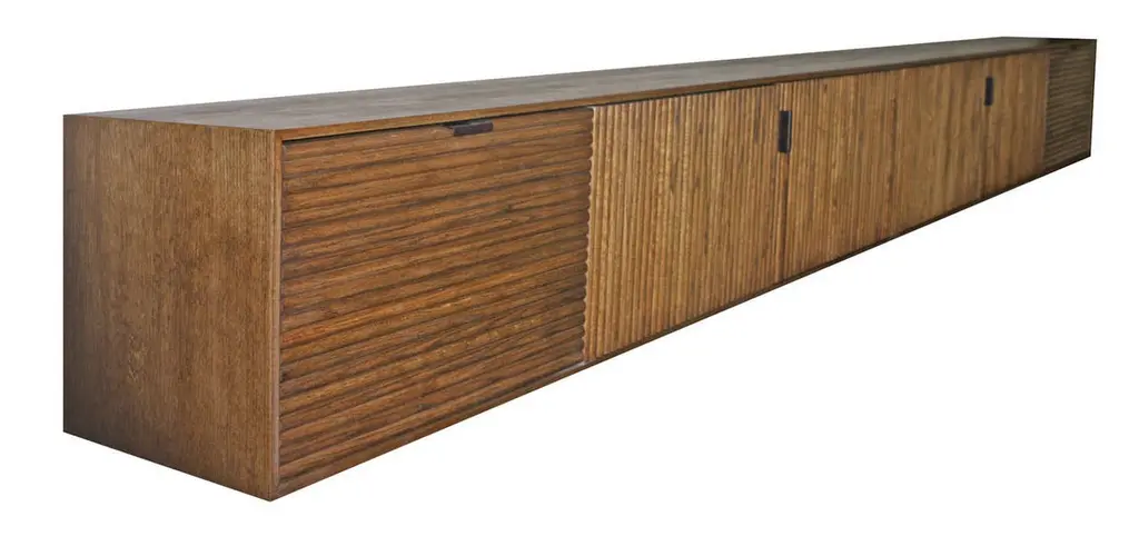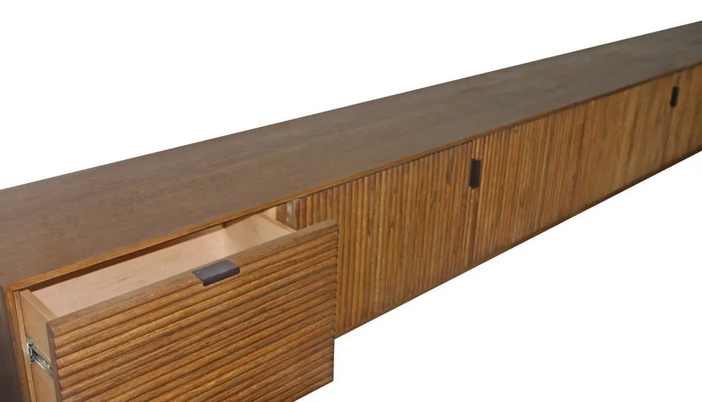 Tambour-clad wall-mounted buffet, credenza or console shown in oak with walnut stain.Measures: 12' W x 16" D x 16" H each.Made to order.Lead time 12-14 weeks.Custom sizes and finishes available upon request.