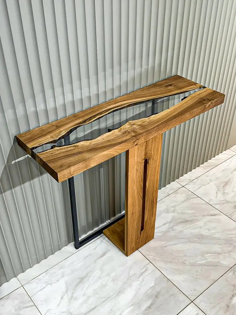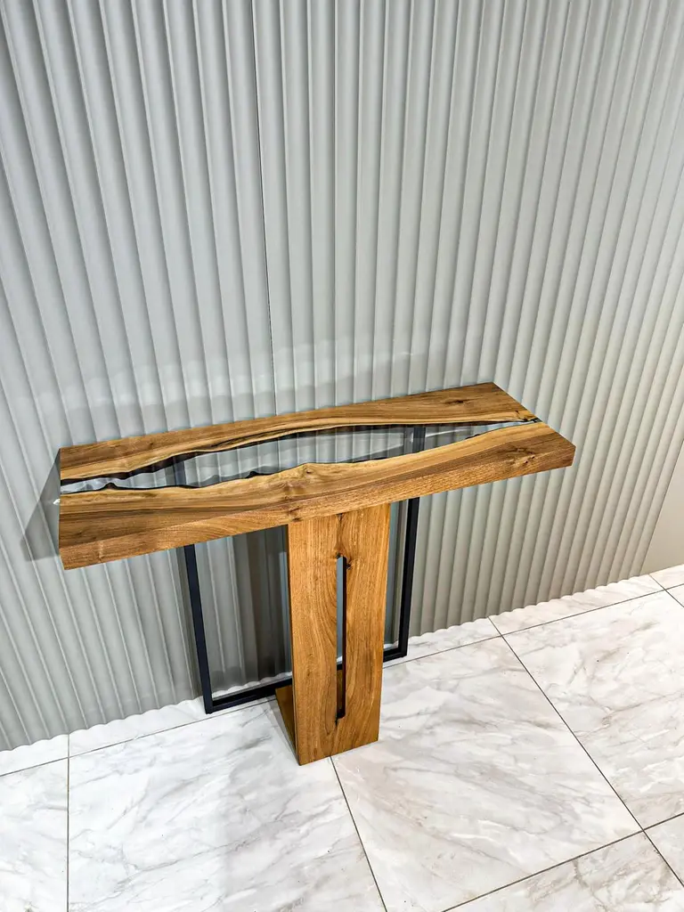 Walnut Wood Epoxy Console TablePresenting our Epoxy Waterfall ConsoleTable – a true sample of craftsmanship and elegance. This exceptional piece of furniture is designed to be more than just a coffee table; it's a statement of refined taste and contemporary style.With waterfall console table's modern design and appeal, it's the perfect piece for your home, combining functionality with an aesthetic.This console table is made of walnut wood. And it can be customized according to your taste in terms of kind of wood, epoxy colour, finishes etc..