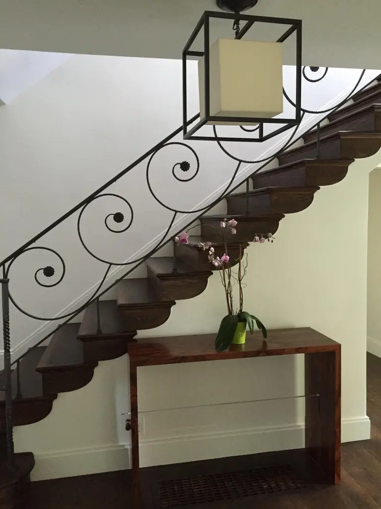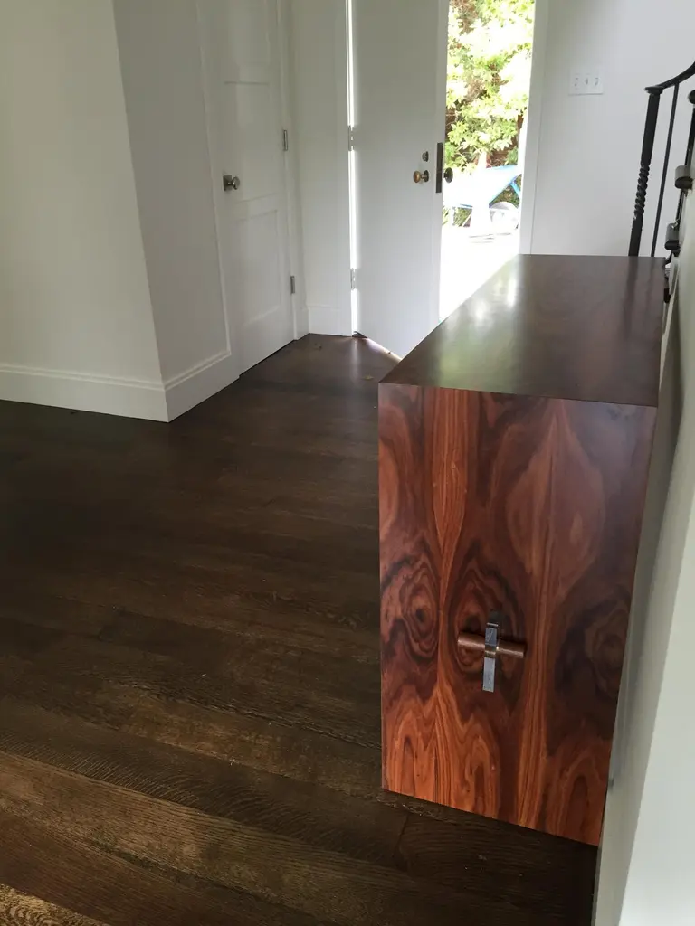 The walnut console is a handcrafted edition, with tapered legs and brass or aluminum inlays, mitred corners and traditional joinery. Custom sizes and finishes available.