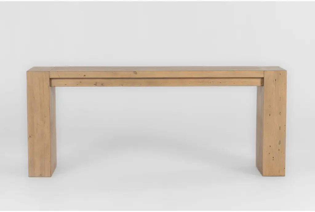 Solid salvaged oak wood beam console table with light washed finish. Simple rustic modern design, featuring butterfly enclosure details. Each will vary in exact tones, grain, and inherent imperfections.