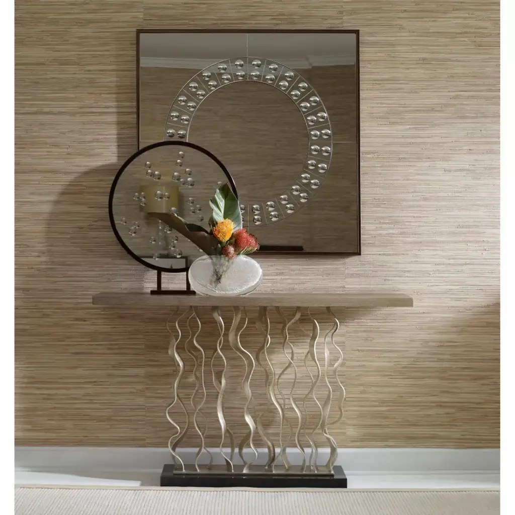 Hammered metal silver leaf ribbons wave and ungulate vertically to hold a rectangular Oak top. A thick slab of Nero Absolute stone creates the base.