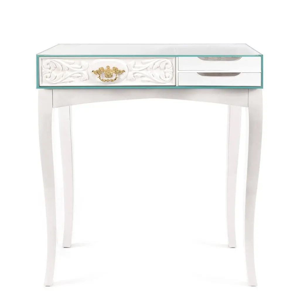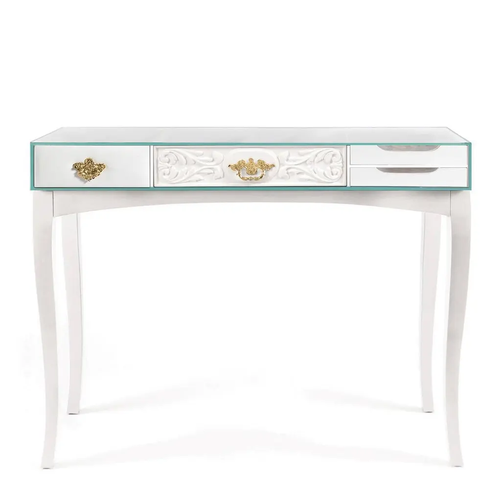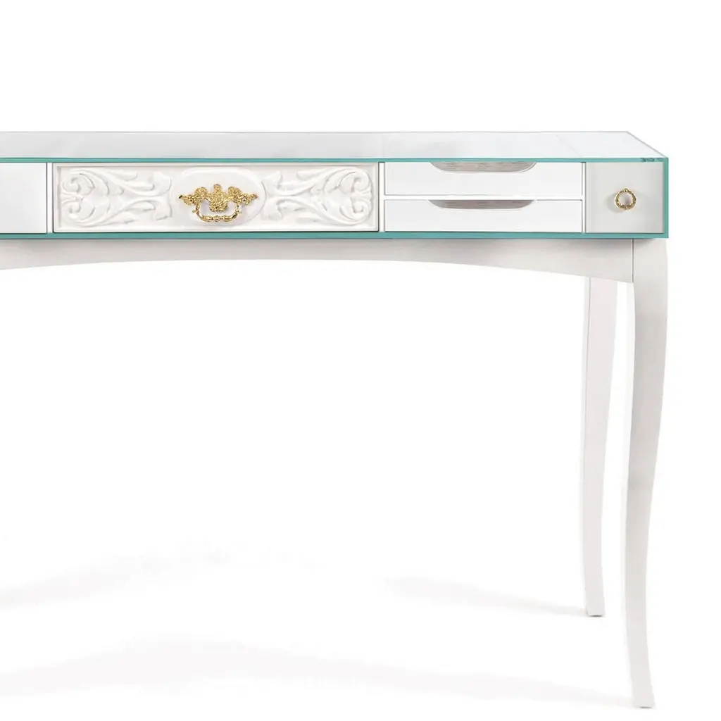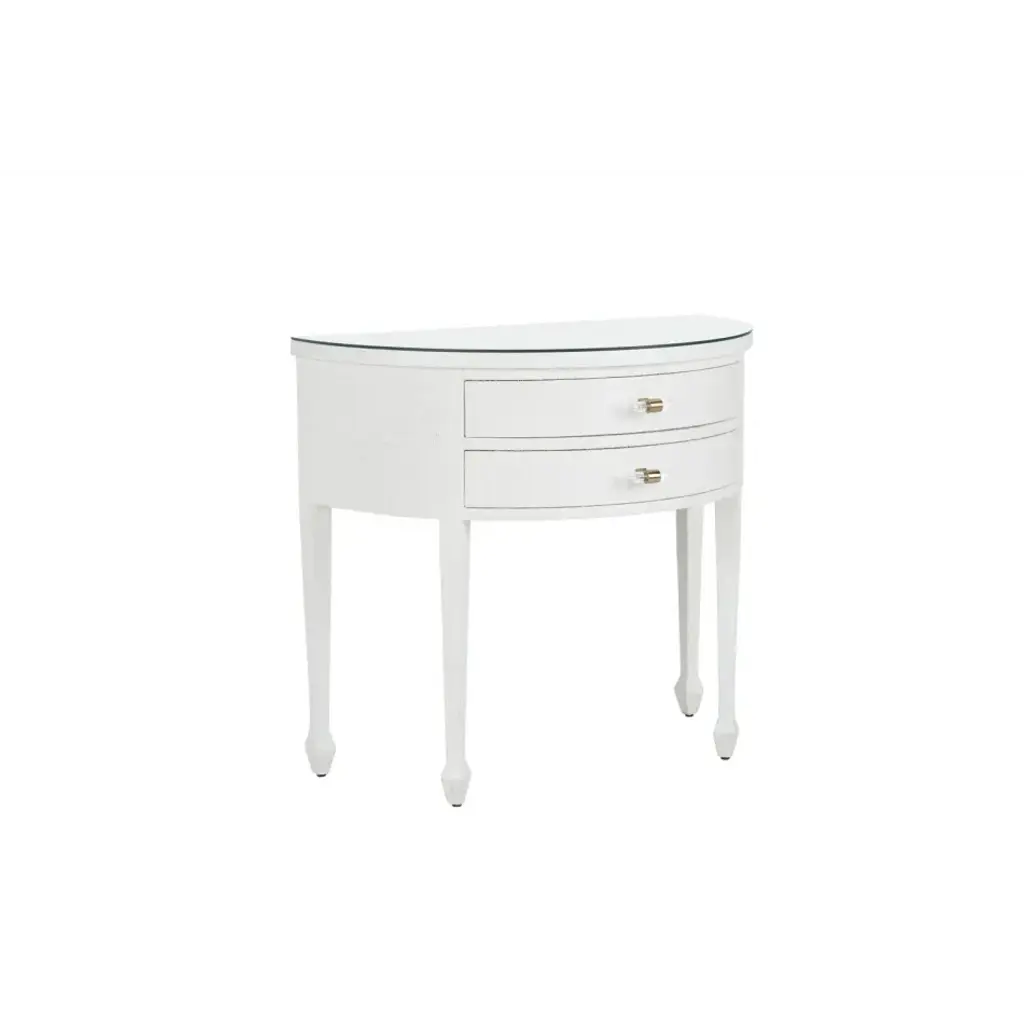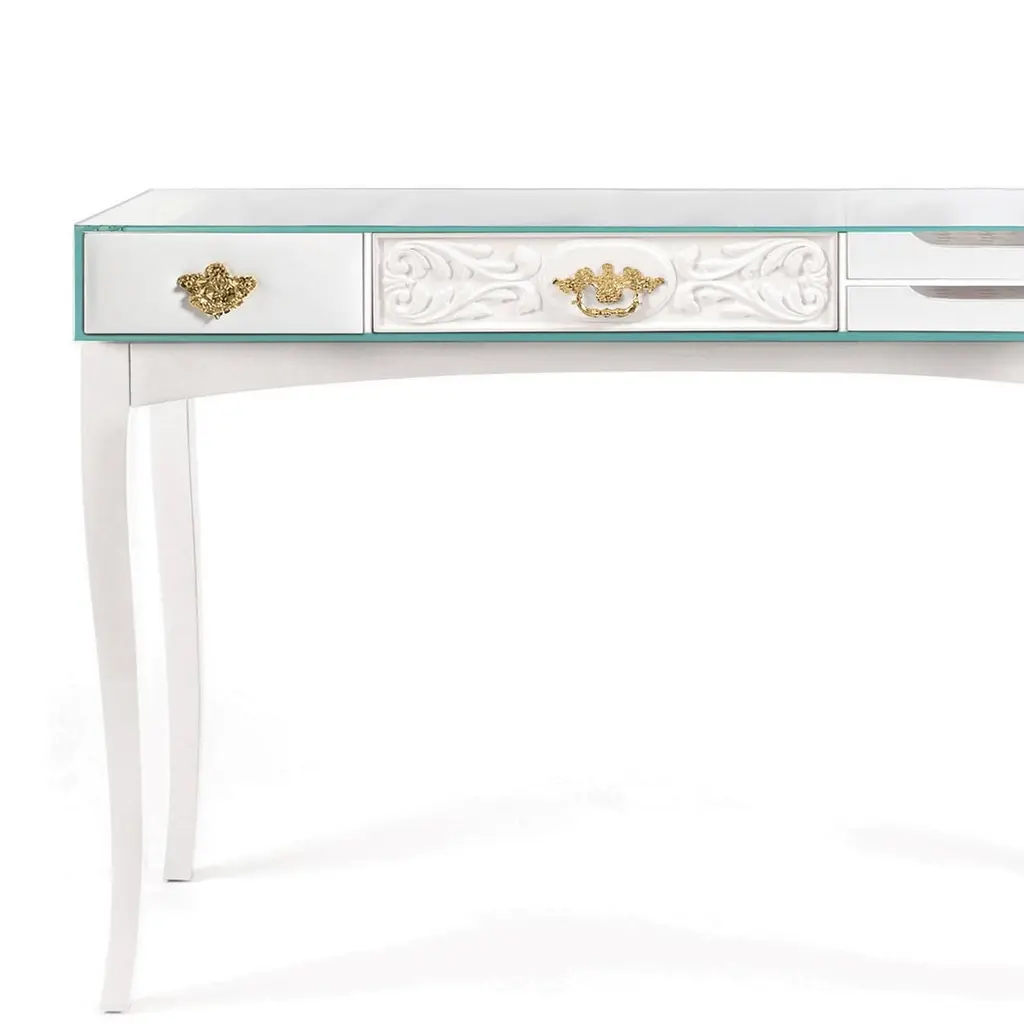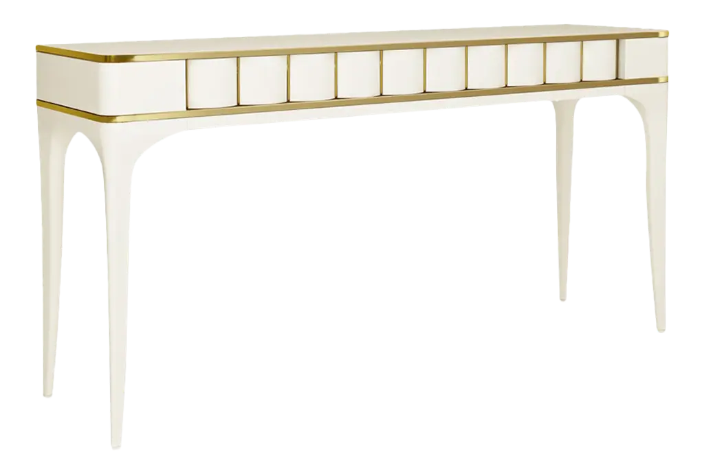 Console white finishes made with rosewood andwith lacquered glass top. With 5 drawers. With brass handles.Available in:L 118 x D 43 x H 87cm, price: 9900,00€.L 105 x D 43 x H 87cm, price: 9500,00€.L 90 x D 43 x H 87cm, price: 7900,00€.L 85 x D 43 x H 87cm, price: 7600,00€.Also available in Multi-colors finishes or in Black finishes.