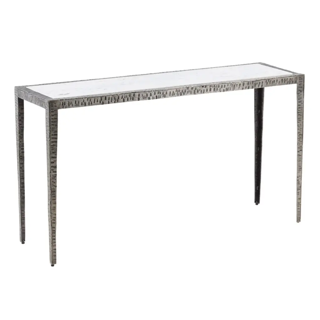 Modern Banswara white marble inset top console table with gunmetal grey finish hand hammered iron frame. Each table will have variations in natural marble appearance, veining, and coloring, as well as iron patina/hand detail differences. Weight is approx. 85 lbs.