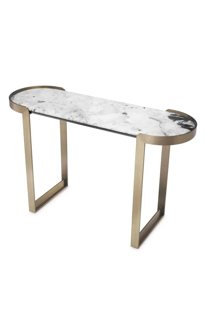 Taking inspiration from Art Deco design, the Fabio Console Table is a stylish addition to any hallway and a perfect base for showcasing flower arrangements, picture frames, and other decorative objects. Finished in brushed brass, the metal legs elegantly curve around the ends of the pill-shaped tabletop from Barcelona marble.