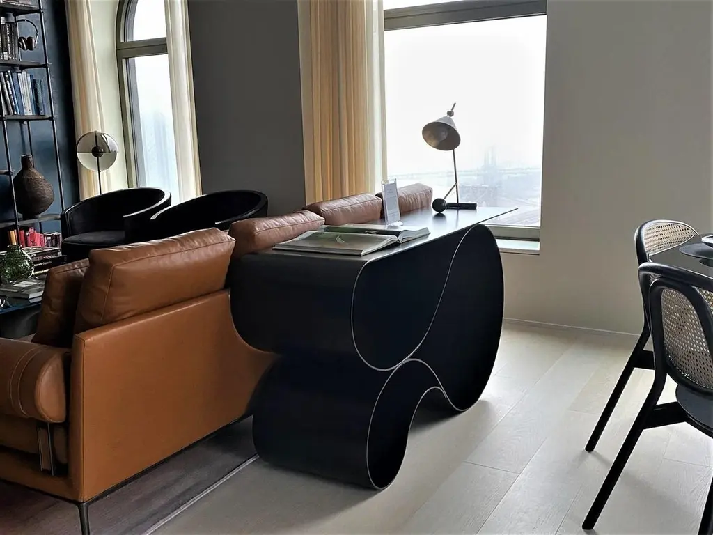 Whorl console in black matte powder coated aluminum by Neal Aronowitz DesignDimensions: D 43.2 x W 160 x H 76.2 cmMaterials: Powder coated aluminium.Size, colors and finish can be modified and customized. An elegant and powerful sculptural statement. This is a console that is an unforgettable and dynamic presence in any room.The now iconic lyrical form of the award winning Whorl Table series this time executed in powder coated aluminum. 1/4" thick aluminum is fabricated into the magical folds of the Whorl form, seemingly defying gravity!Displayed here in a black matte color. Hand-crafted in Portland, Oregon USA. The Whorl Console can be customized to any color and finish among thousands available.Neal Aronowitz art/design was founded in 2014 and with just a few powerful and iconic pieces of furniture and lighting, has quickly won acclaim in the international design world.The vision of the studio is the design and fabrication of highly sculptural, hand crafted bespoke furniture and lighting.Aronowitz’s debut piece was the Whorl Coffee Table, which won international notice including a feature in Elle Décor and was the recipient of a People’s Choice Award at the AZ Design Awards, sponsored by Azure Magazine.