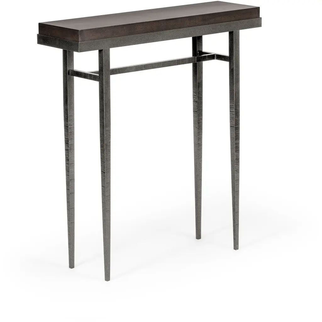 The Wick Collection's mid-sized console table is perfectly suited to a variety of spaces. With three options (Clear, Grey, and Espresso) of iconic solid Vermont maple wood, the Wick 42" Console Table offers a great deal of versatility. With its 1.5" thick, solid maple wood top securely nestled in its steel frame, the Wick's long, elegant steel legs are hand-hammered and extend to the floor in a sleek taper, for a classic table with a contemporary design. Available in all standard finishes.