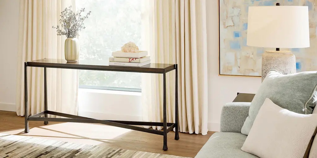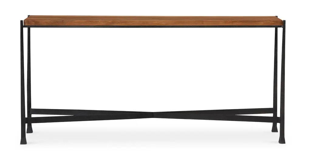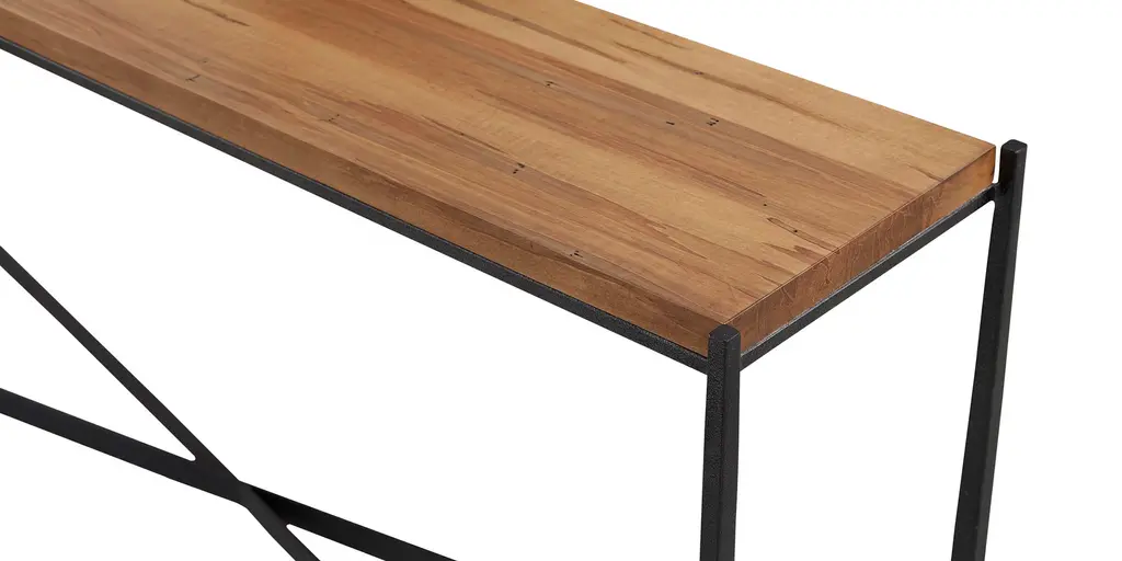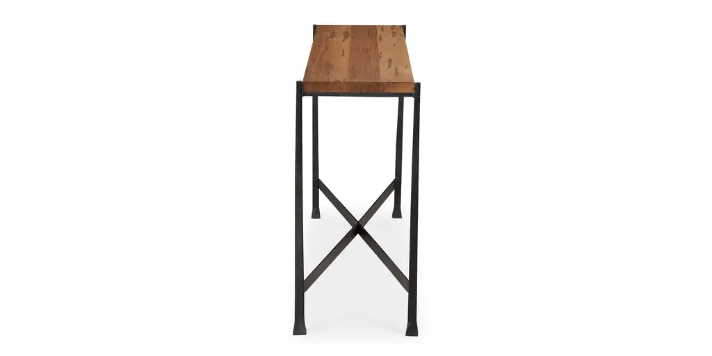 Place it behind a sofa or near a window, in a narrow hallway, or beside the entry. Wherever you find the Winchester console table, its quiet contrasts bring your favorite elements together. A natural wood top in 1 " thick Appalachian maple charms with its hand-applied finish that brings out every detail of the unique wood grain. The textured cast iron base forms an X, with gently tapered legs widening slightly near the bottom. A powder-coated finish in dark ebony completes the graceful picture. Hidden levelers ensure that the table sits sturdily on uneven surfaces.