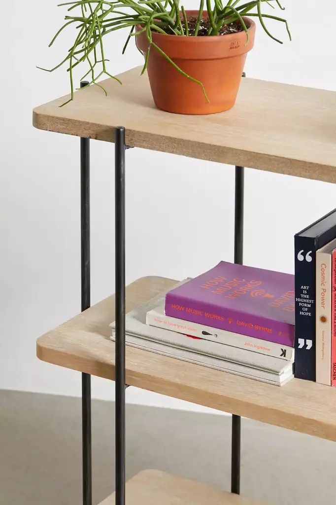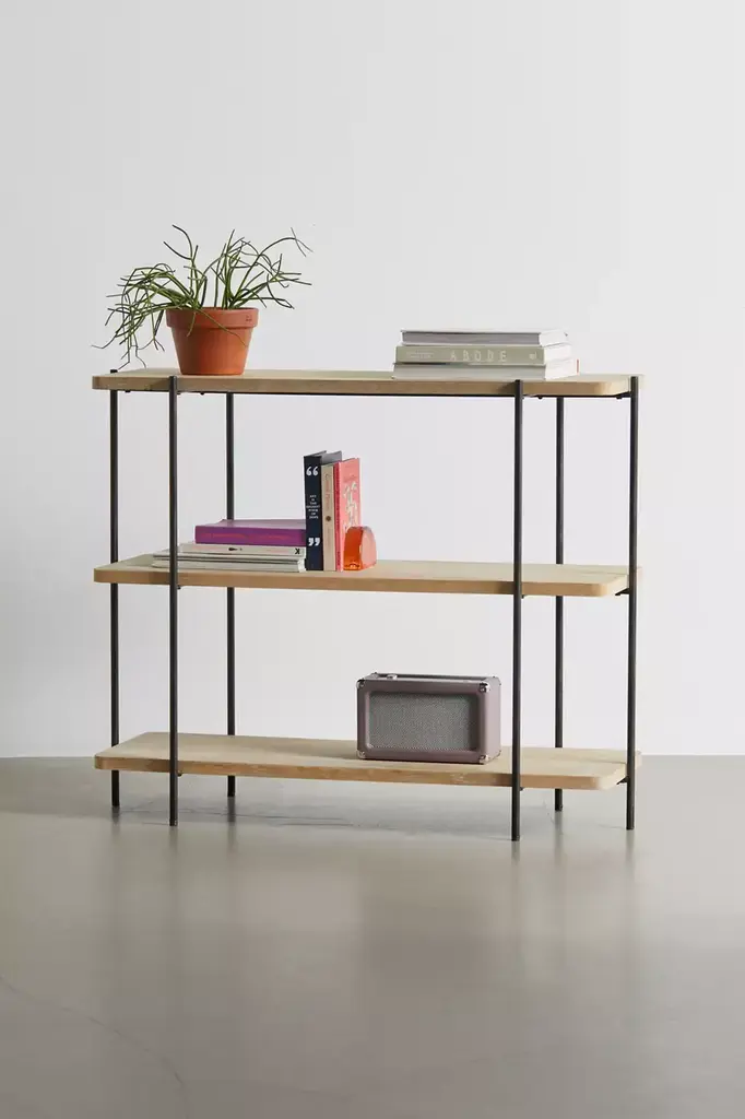 Industrial-modern console table, perfect for displaying your record player, art books, ceramics and more. Three tiers of wooden shelves offer plenty of ways to store your faves, supported by a slim metal frame. Assembly required.