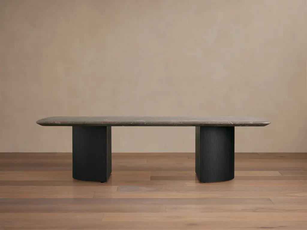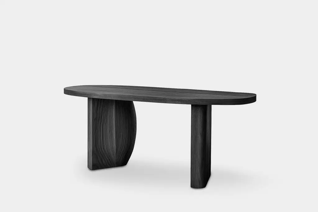 A versatile and elegant console table, the Flame Console is reminiscent of a small visual backdrop, which opens up to embrace the different contexts of domestic living and common areas in the hospitality world. As part of the design, the rigor of the top establishes a dialogue with the two sinuous flared metal supports on which it appears to be suspended.