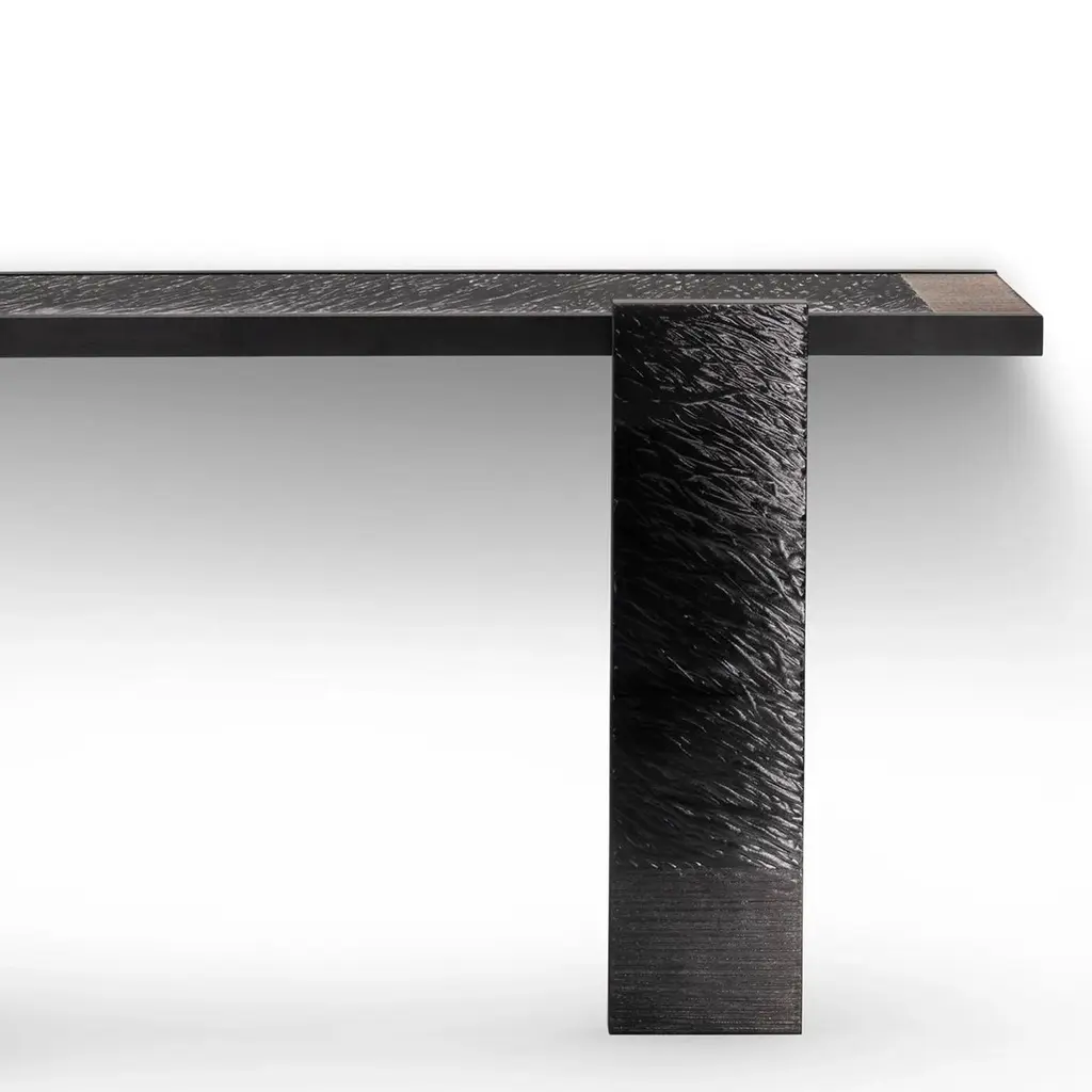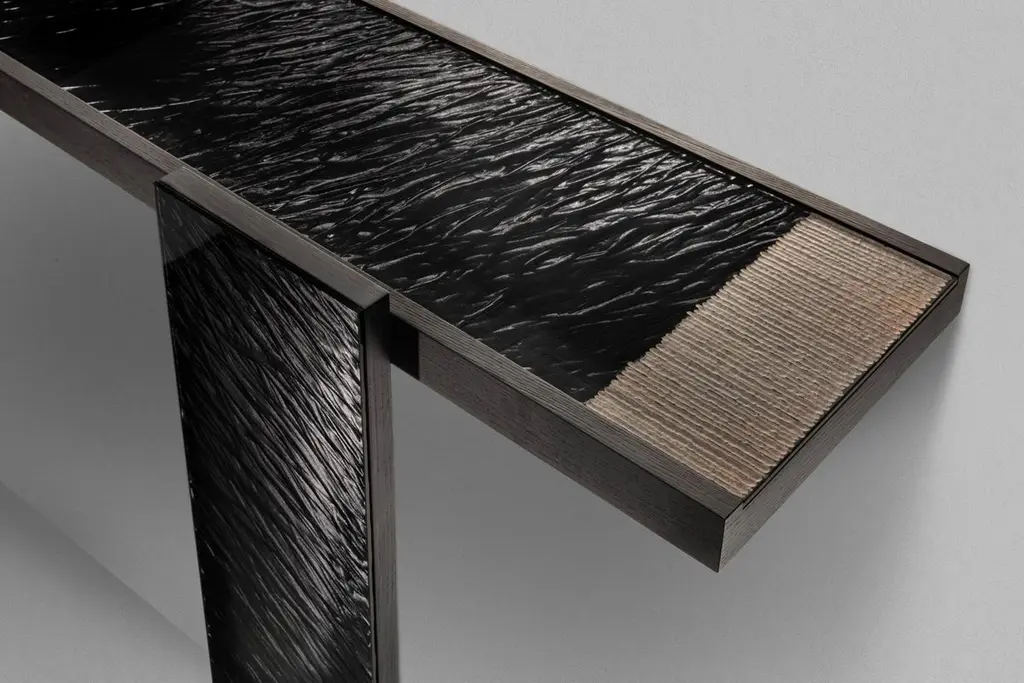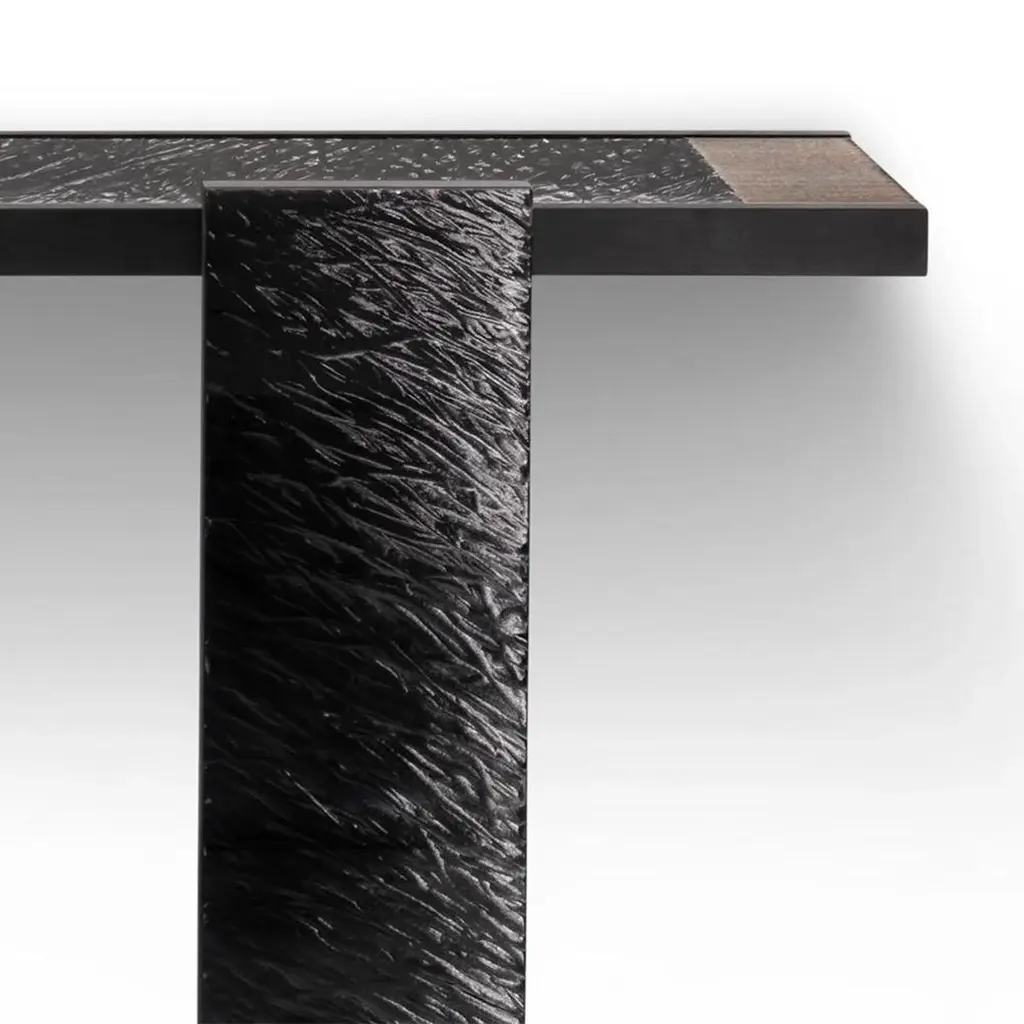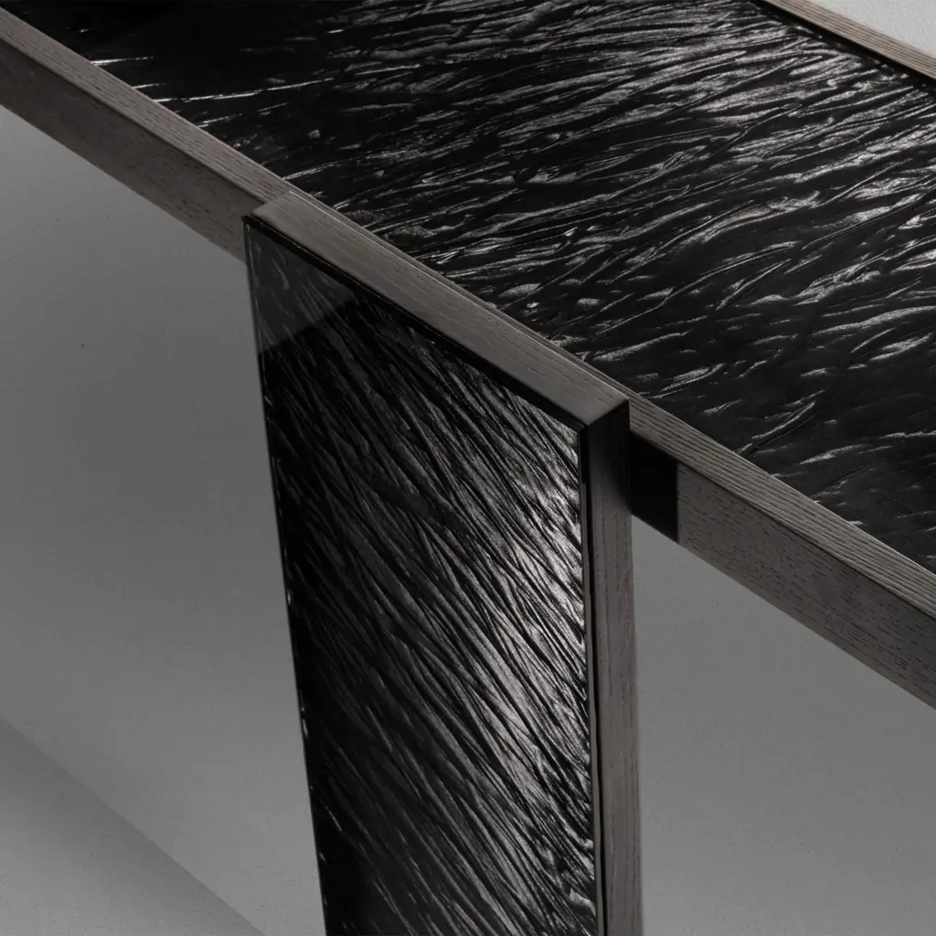 Console Table Woodenglass Wall with 3 parts all in wood instained black ash veneer, top and front legs covered in extra-clear engraved glass, with glass details in bronzed finish.