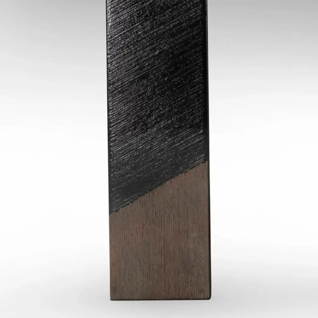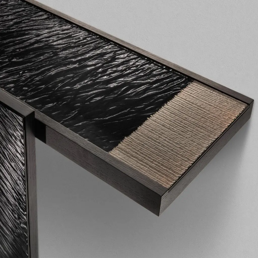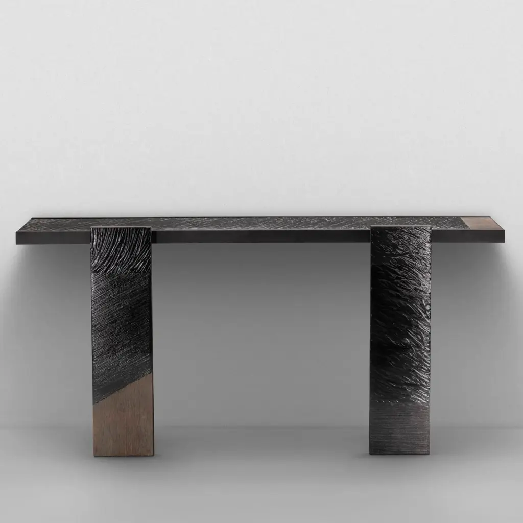 Console Table Woodenglass Wall with 3 parts all in wood instained black ash veneer, top and front legs covered in extra-clear engraved glass, with glass details in bronzed finish.